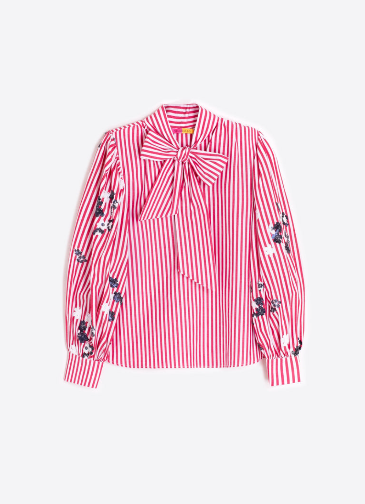 This red and white striped shirt blends romantic detailing with classic style, featuring a flattering V-neck with lace-up design and voluminous long sleeves. Finished with delicate floral embroidery on both sleeves, this women’s striped blouse adds a feminine, statement touch to everyday looks.