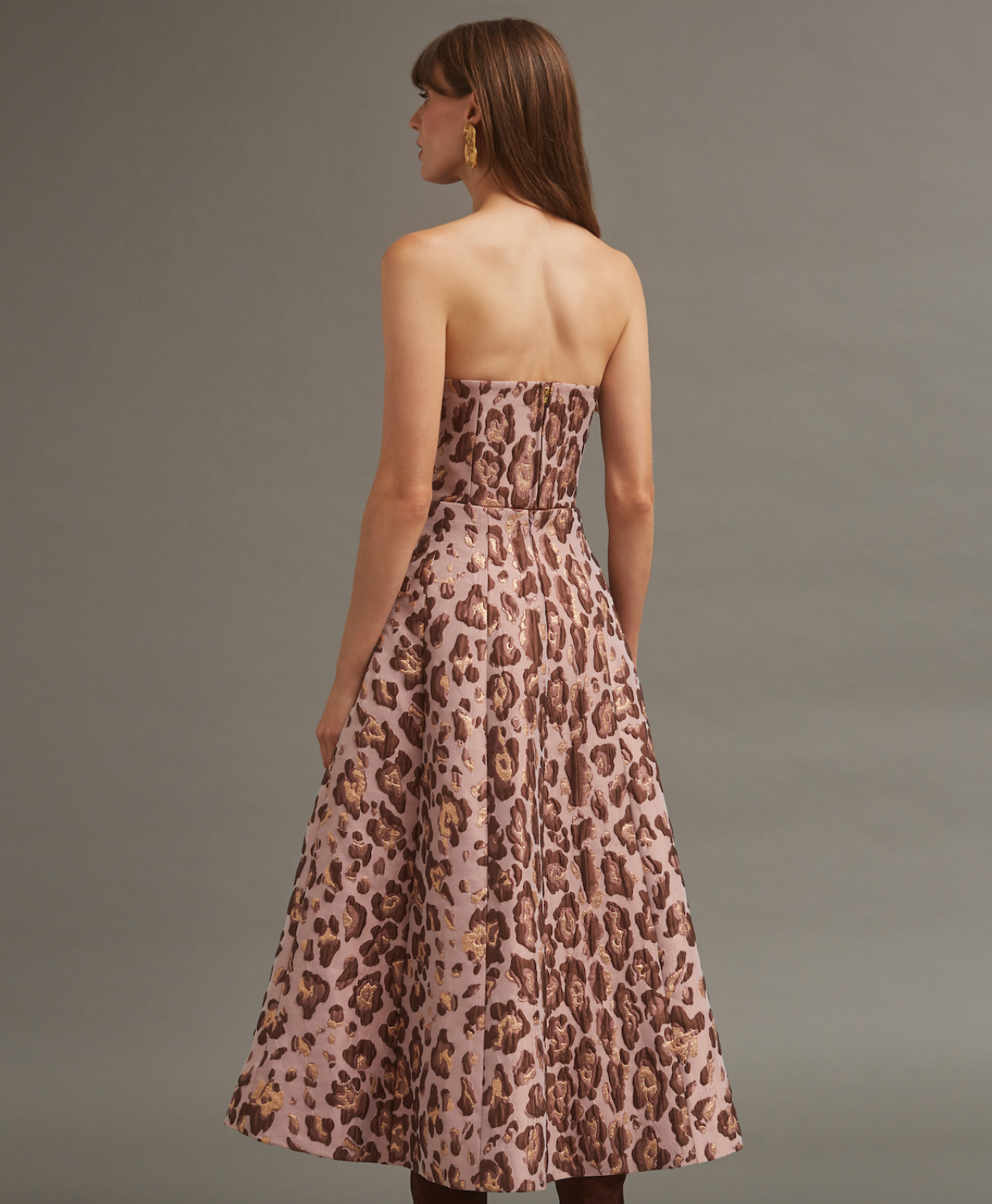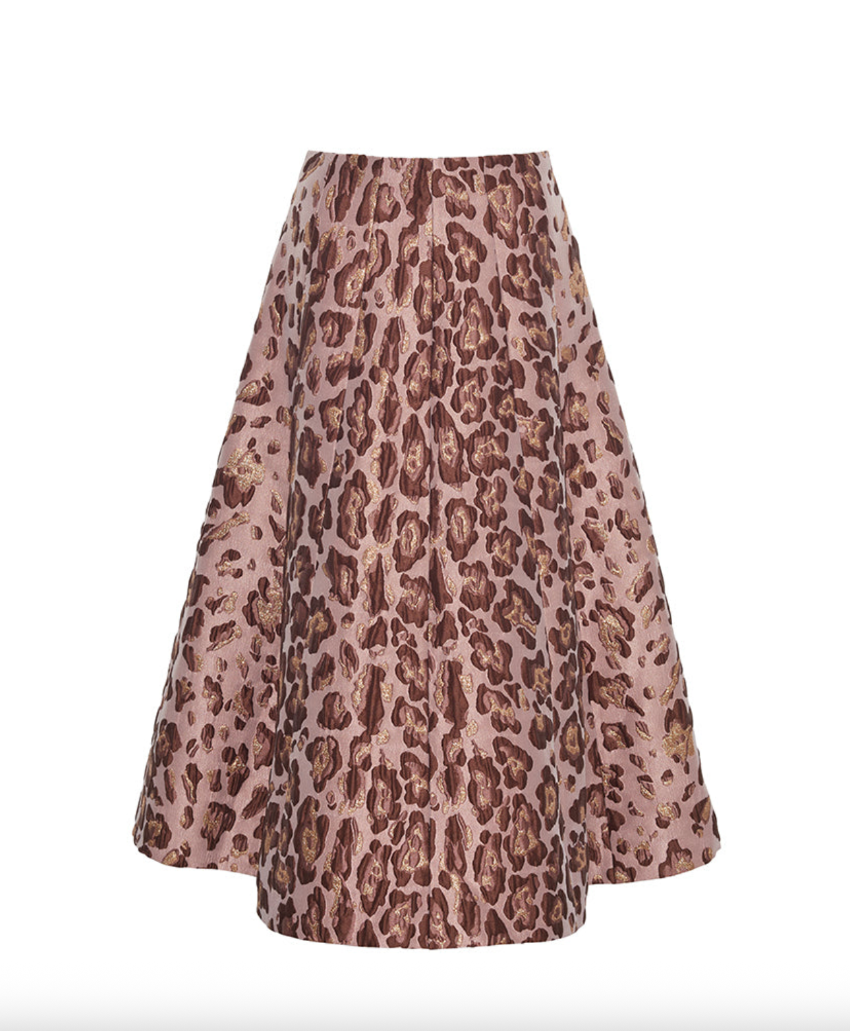 A statement-making midi skirt with subtle shimmer and sculptural detail. Designed in a high-waisted A-line silhouette, it features paneled construction across the front and back for a flattering drape. Crafted in an animal-patterned jacquard with rose gold and blush tones, it’s fully lined and finished with functional seam pockets.