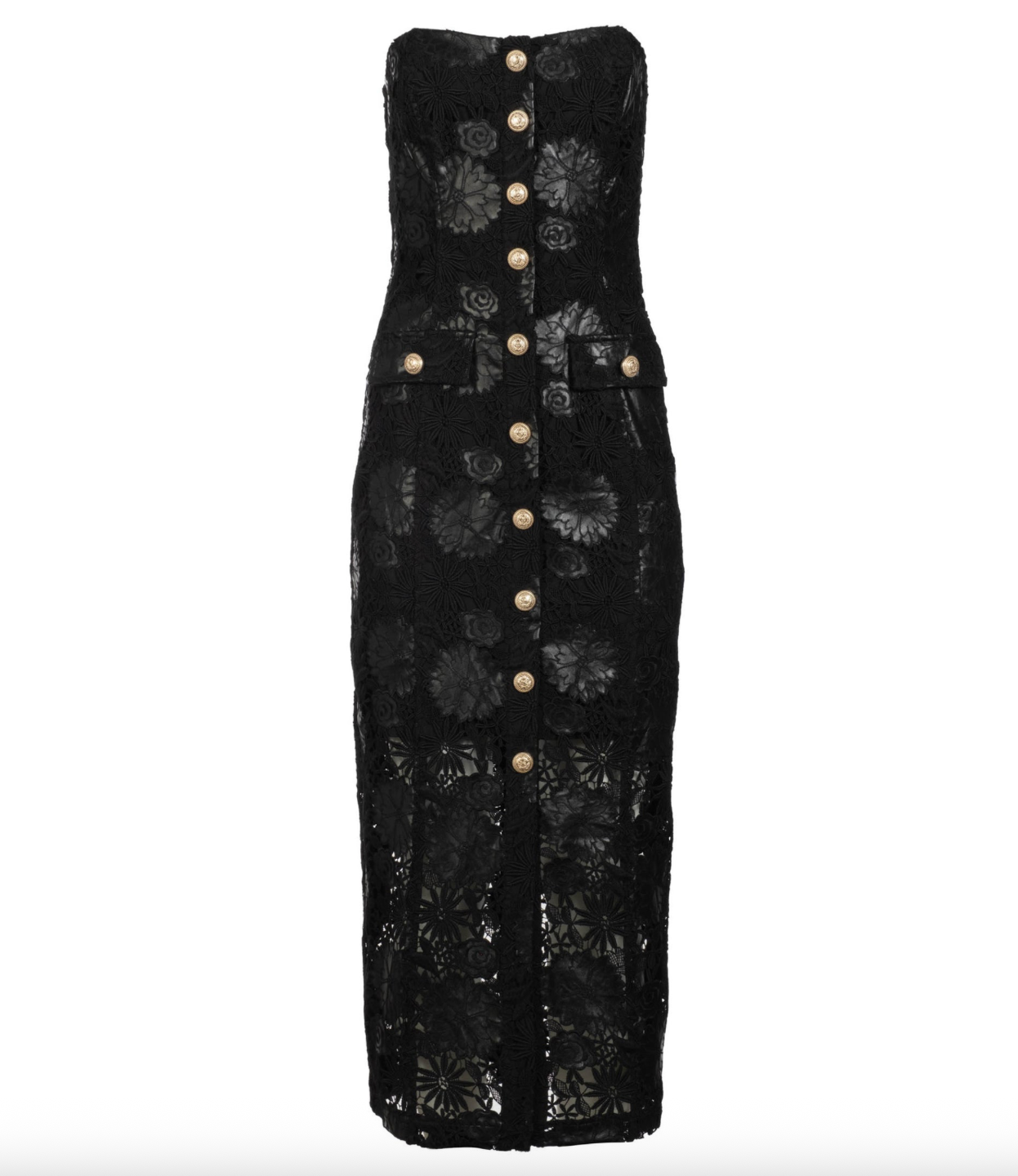 Vegan leather and floral Guipure lace intertwine in a striking mix of edge and elegance. Finished with refined gold buttons, this statement midi dress delivers bold style while maintaining polished sophistication. Perfect for fall, it’s designed to turn heads from day to night.