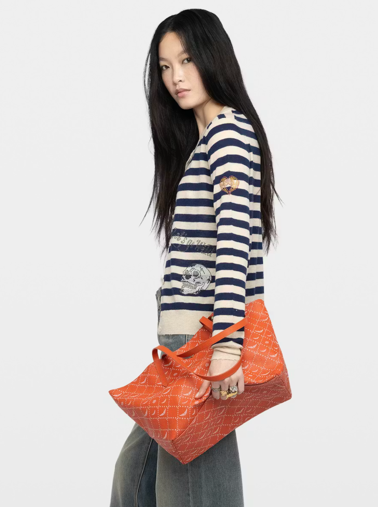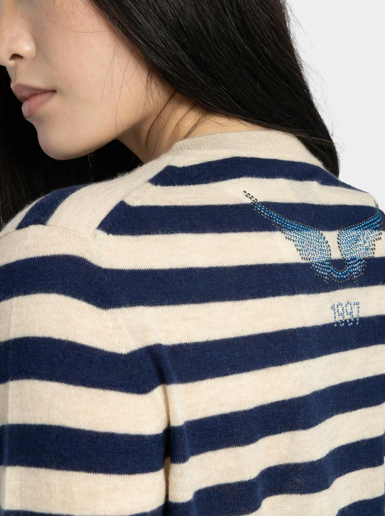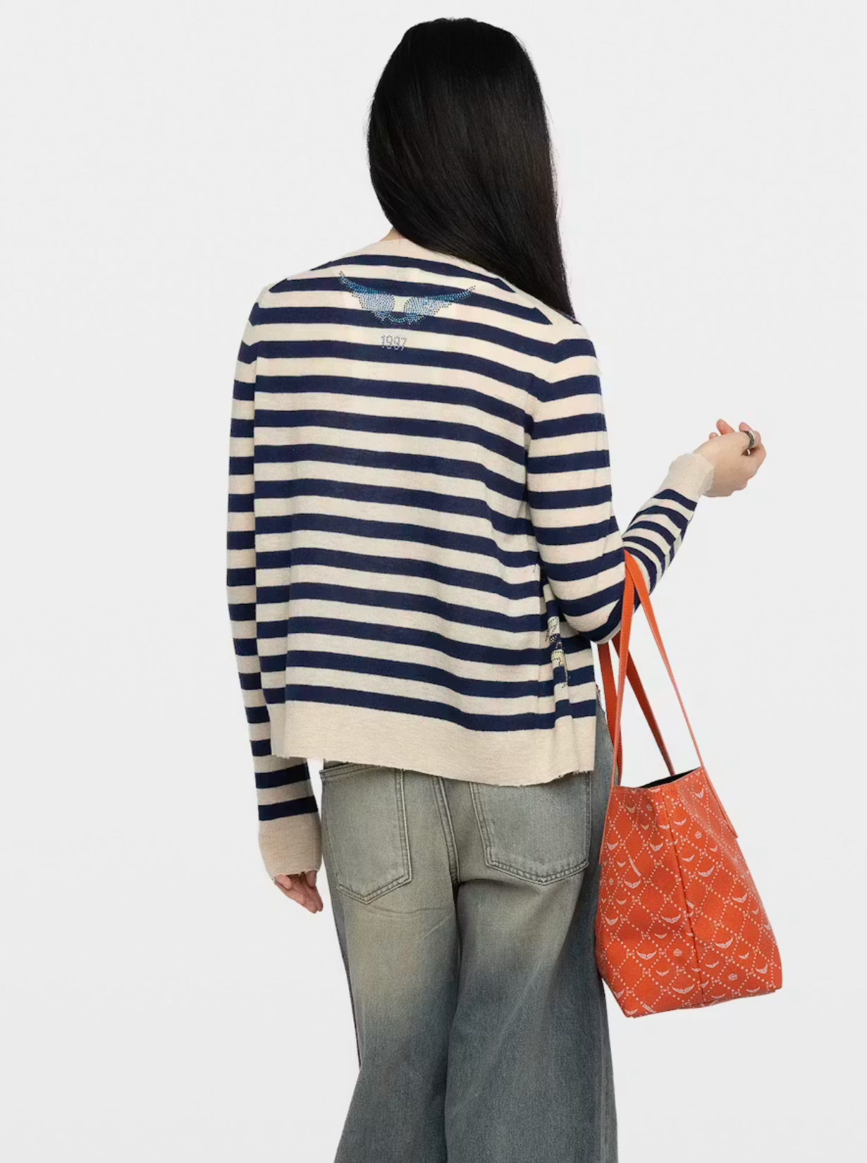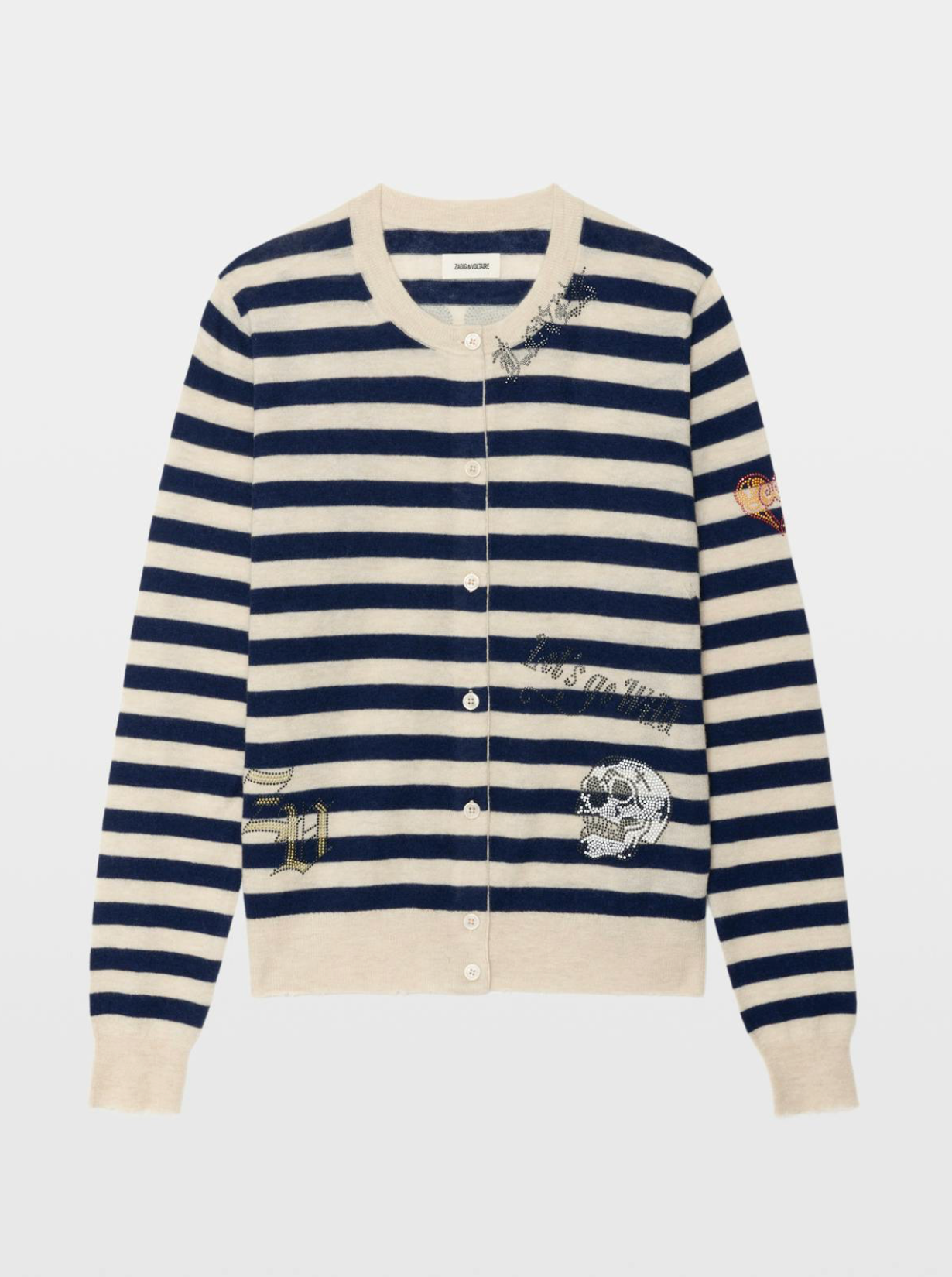 Luxurious and effortlessly refined, this cardigan is crafted from 100% cashmere for an ultra-soft feel and lightweight warmth. Designed with a classic crew neckline and button-front closure, it features striped detailing accented with subtle rhinestone embellishments that add a touch of sparkle. The timeless silhouette and long sleeves make it a versatile layering piece for both everyday elegance and elevated styling.