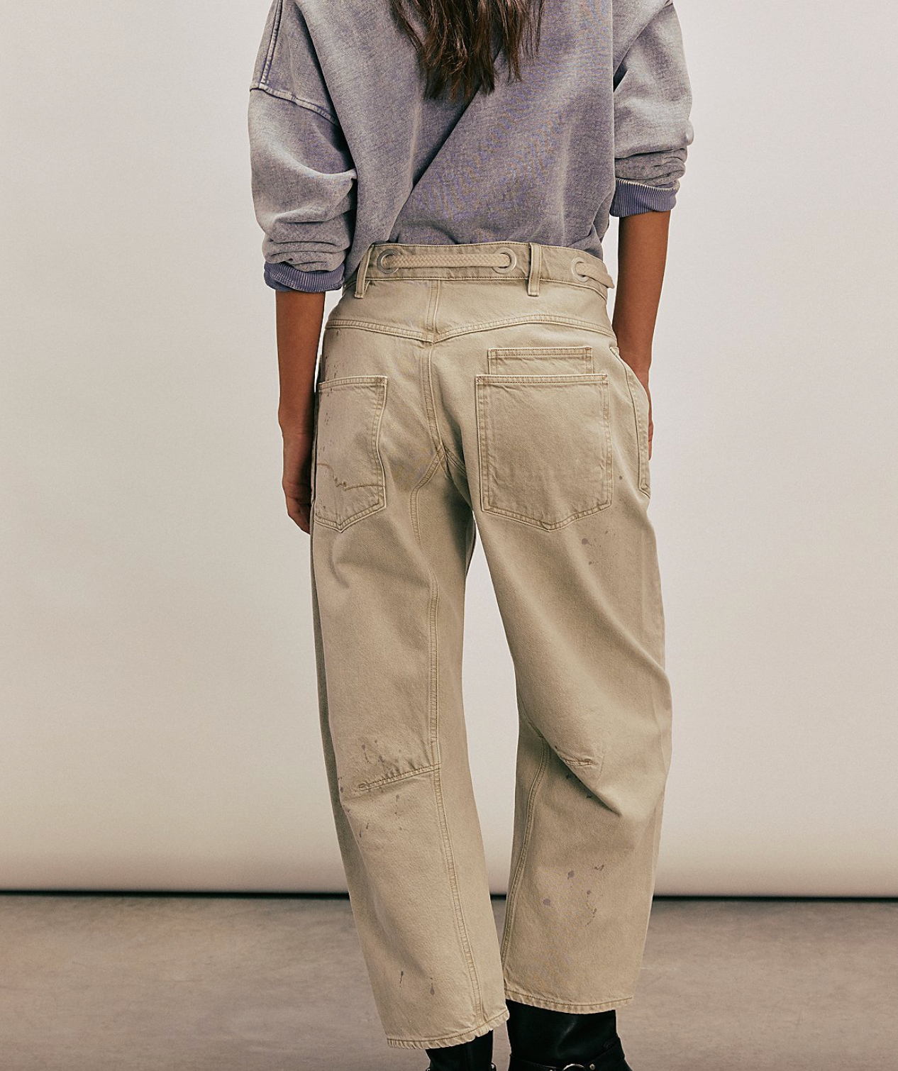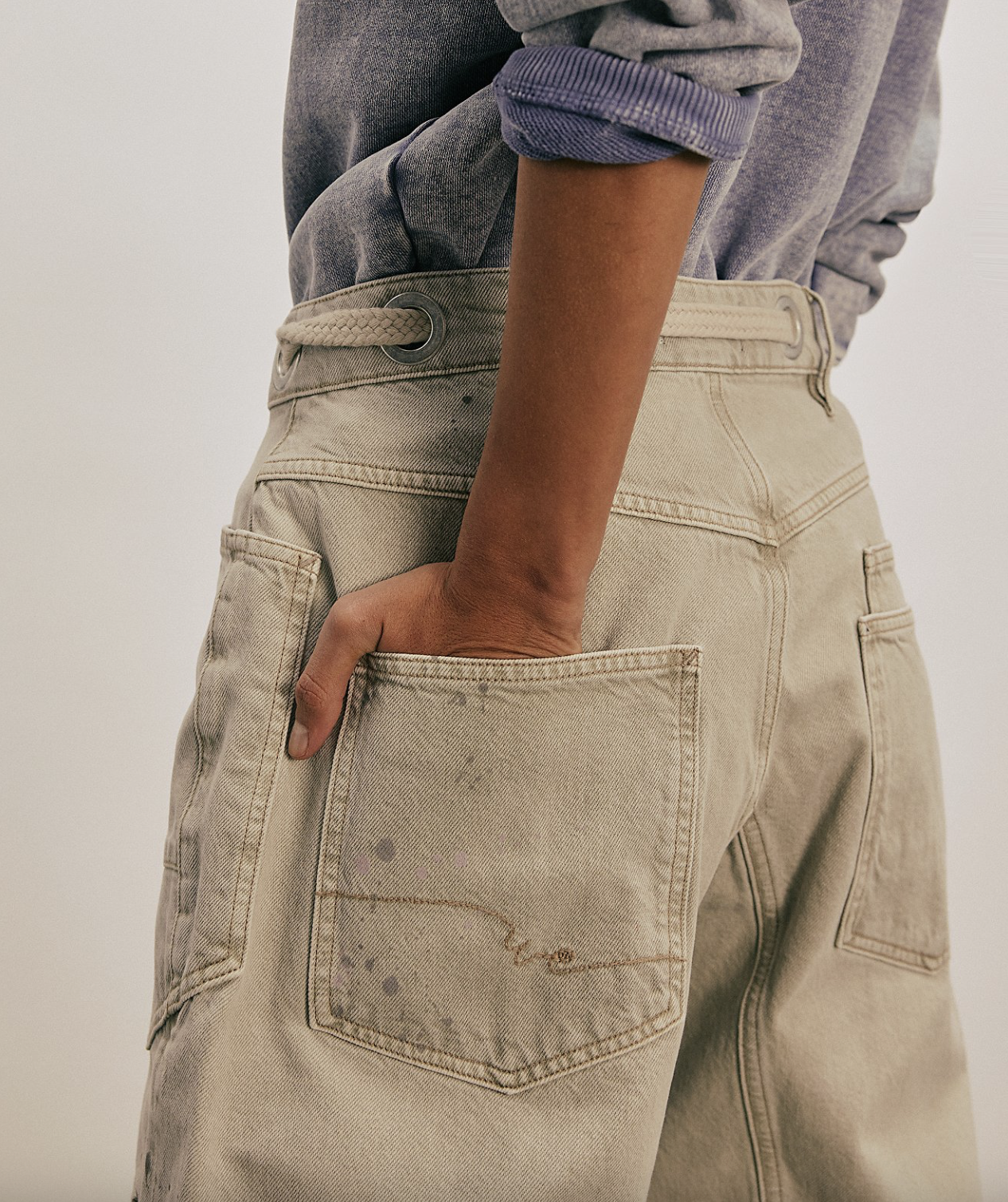 Effortlessly cool and heritage-inspired, these pants feature distressed detailing, paint splatter accents, and oversized patch pockets. The contrast drawstring waist and pull-on style ensure comfort, while the low-slung, slouchy fit with a tapered silhouette makes them a modern, lived-in staple.