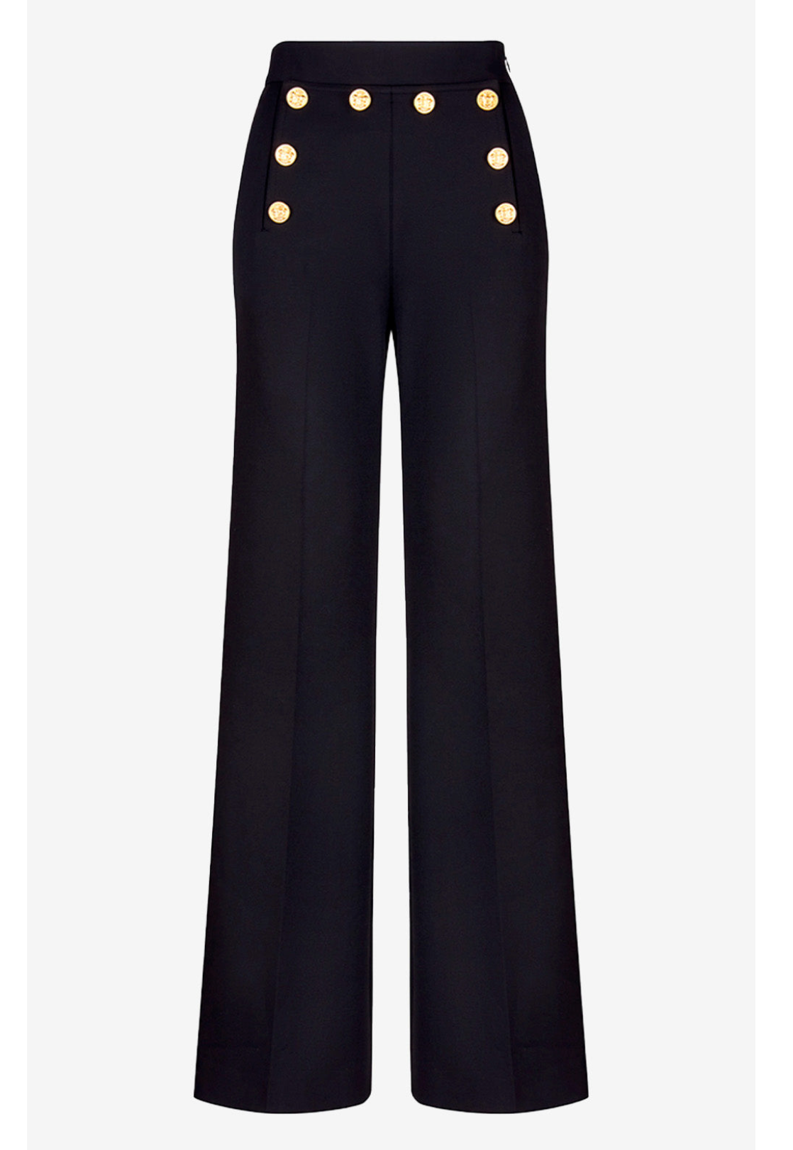 Polished with a subtle nautical edge, this high-rise wide-leg pant is designed to elevate modern suiting. The stretch fabrication offers a flattering, sculpted fit through the waist and hips before releasing into a dramatic full-length leg that elongates the frame. Style it with the coordinating Taped Not a DB Blazer for a sleek, directional suit, or pair with a fitted knit or crisp button-down for refined weekday dressing. Finished with brass button accents and an invisible side zip, this pant transitions effortlessly from office hours to evening plans with timeless sophistication.