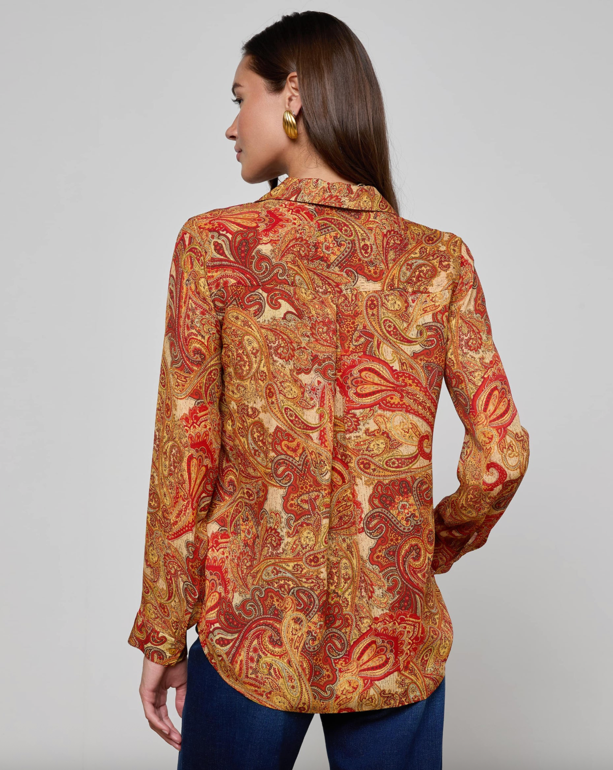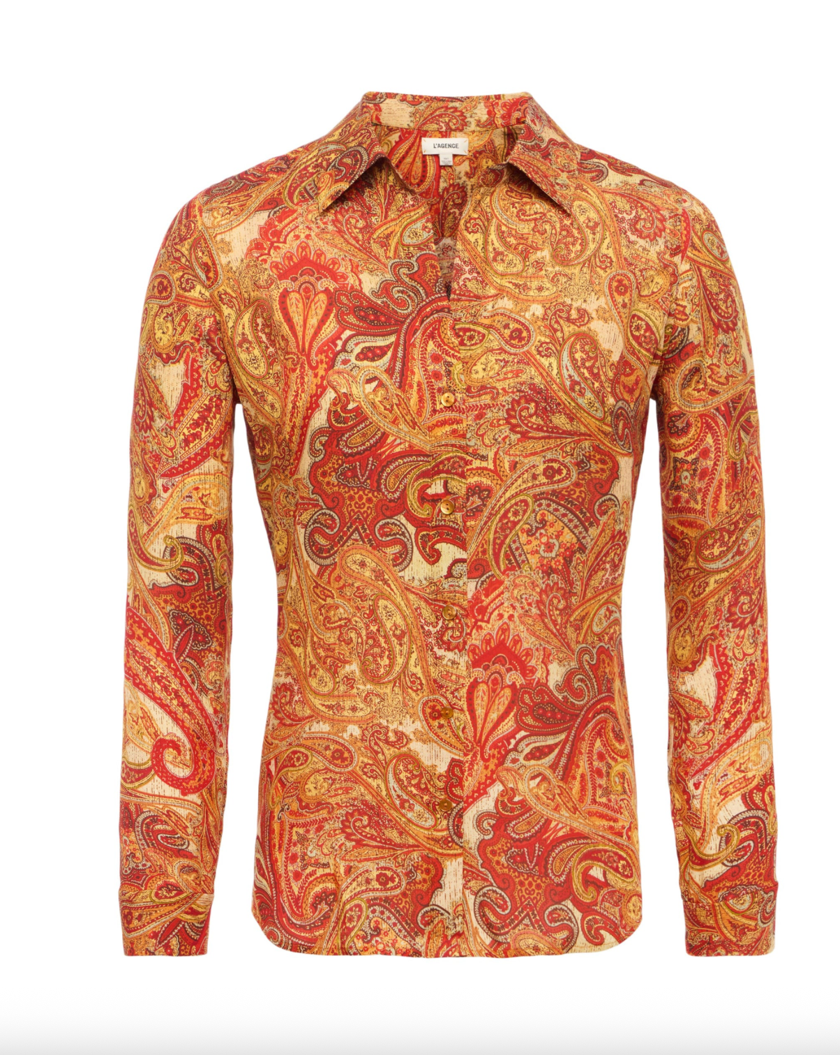 A timeless wardrobe essential reimagined in a striking golden paisley. This classic silk button-down features a relaxed fit and high-low shirttail hem, making it as easy to style tucked into tailoring as it is draped over denim.