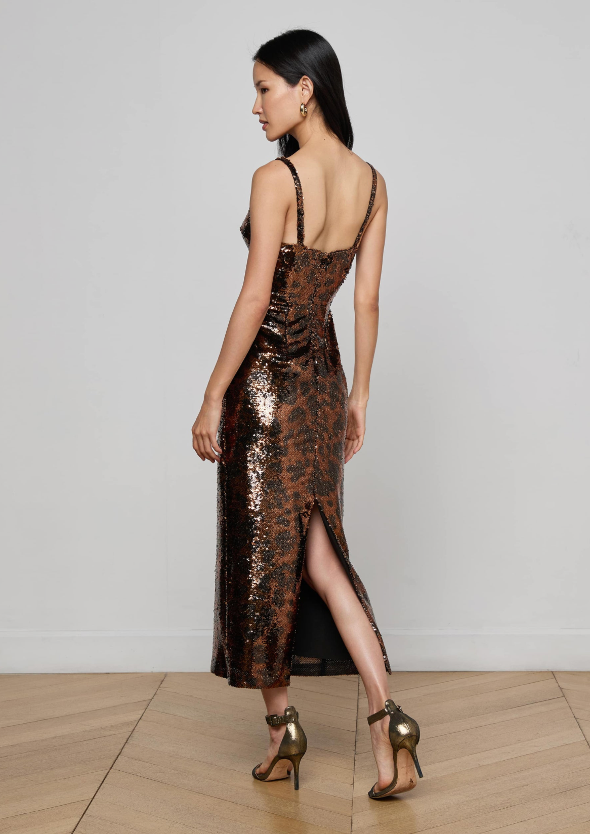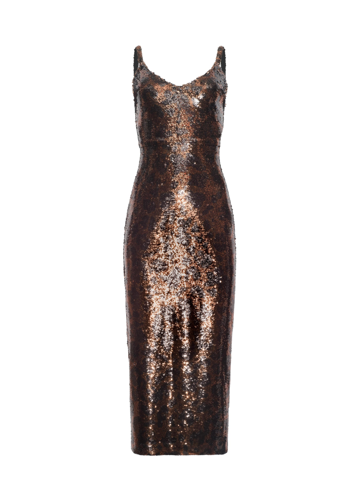 The Noella Sequin Dress brings untamed glamour to a sleek, clean silhouette. Its liquid-like shimmer and tonal leopard design catch the light with every move, while slender straps and a midi length ensure a perfect, flattering fit. Ideal for cocktail parties, special events, or any occasion where making a statement is essential.