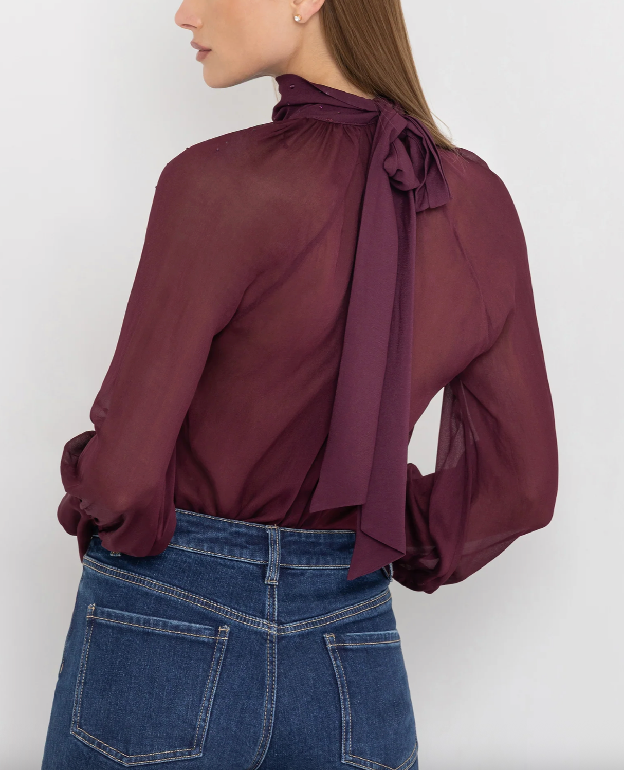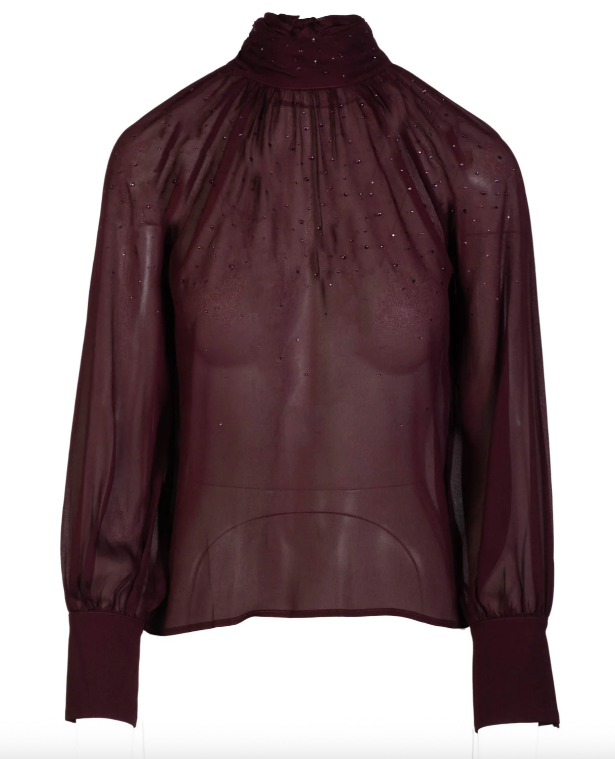 This elegant blouse blends subtle sparkle with refined tailoring for a standout look. Crafted from soft vegan silk georgette in a rich Cabernet hue, it features scattered crystal embellishments, a pleated high neck, and dramatic cuffed sleeves. A delicate back neck tie adds a feminine touch, making it perfect for festive office occasions or polished evening wear.