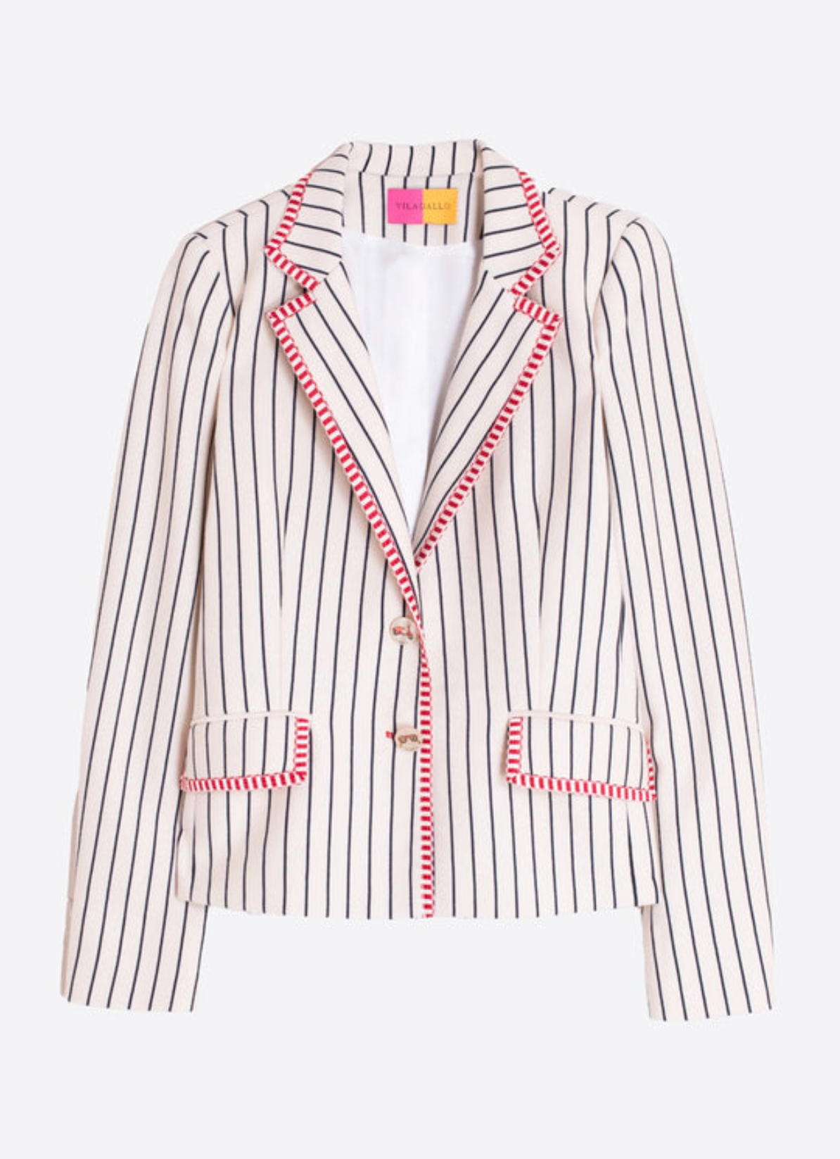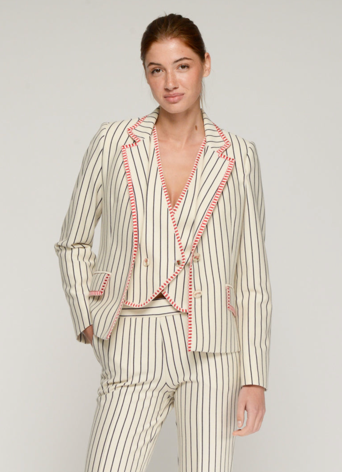 This vertical striped jacket in white and navy delivers a tailored, nautical-inspired look with bold red trim accents. Designed with a classic lapel, one-button front closure, and flap pockets, this women’s striped blazer offers polished style with a modern twist.