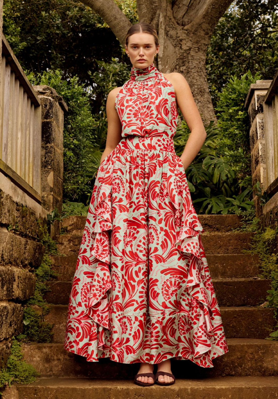 Step into elegance with the Oaklen Skirt, an occasion-ready piece designed to move with grace. Sitting at the natural waist, the shaped waistband creates a flattering silhouette, while cascading ruffles along the front princess seams add dynamic movement and femininity. Perfect for weddings, garden parties, or summer celebrations, the expressive pink-and-blue Bimini print brings a playful, artistic touch to your outfit.