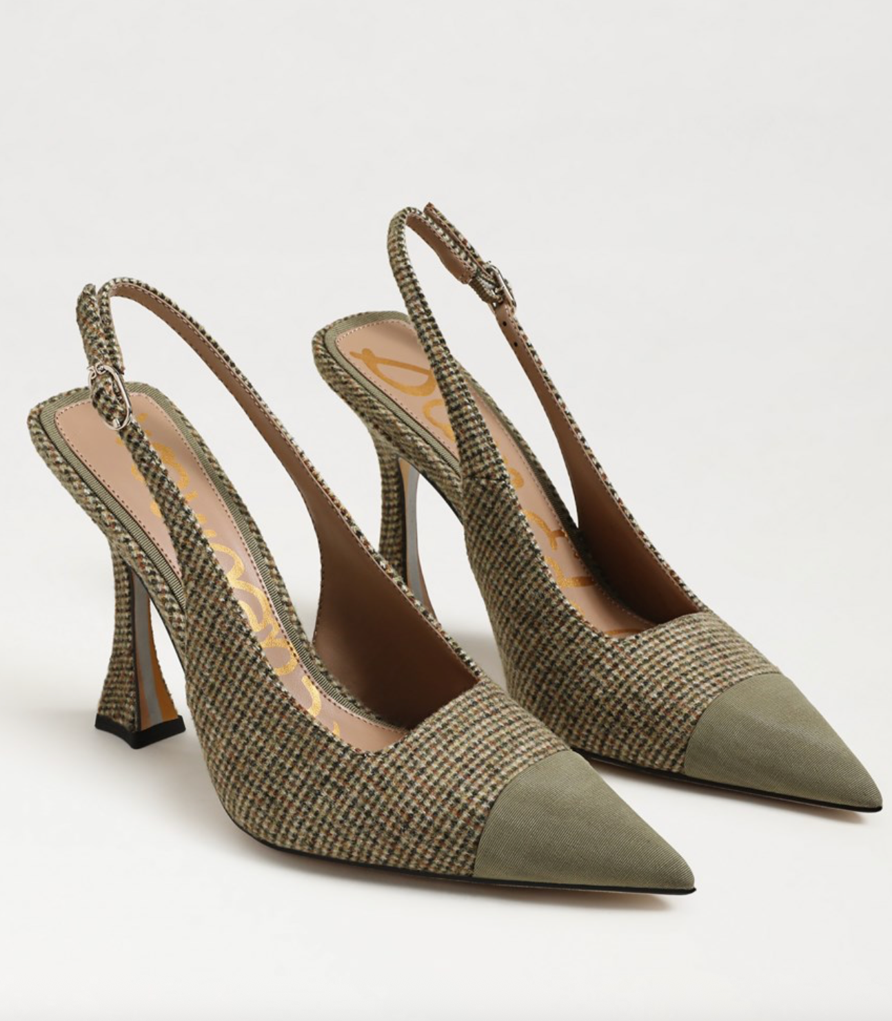Hello to the golden cap toe Odette - the quintessential high fashion meets total wearability shoe collection addition. This pointed pump with contrast cap-toe and flared heel provides the pop and height you are looking for. Sling back and pedestal heel for that stylish and transitional season edge.