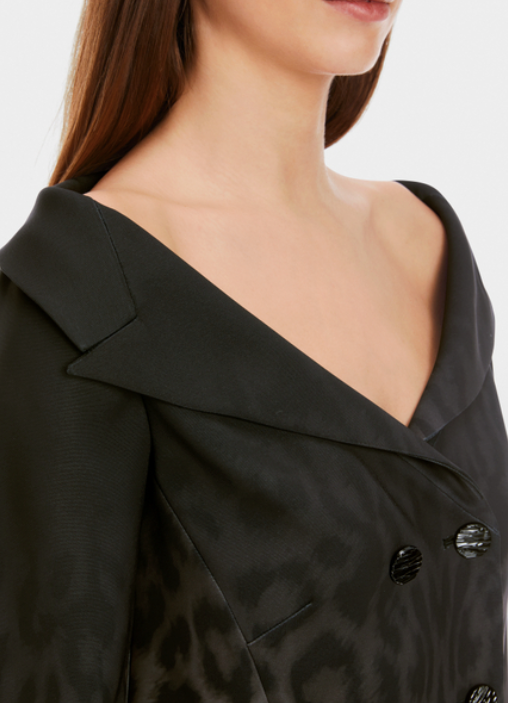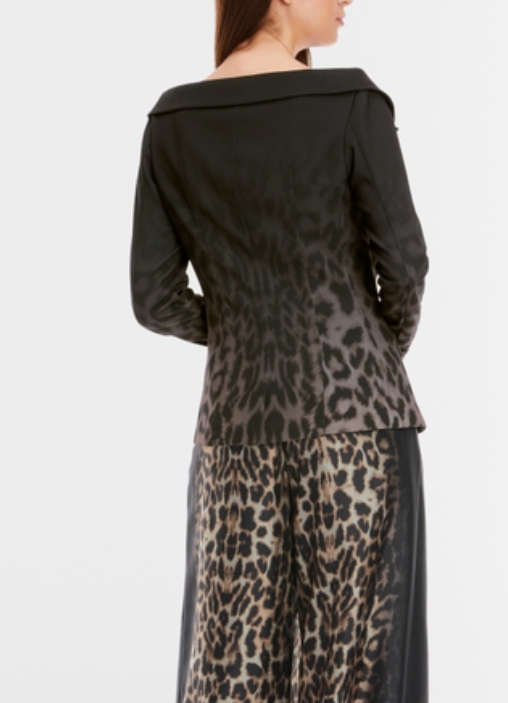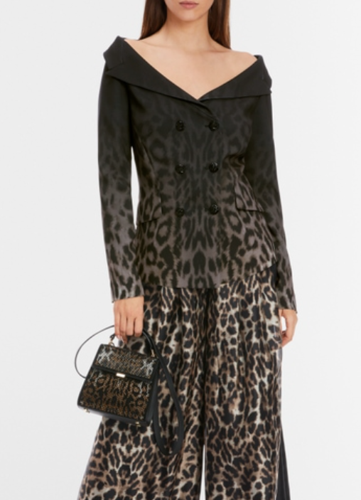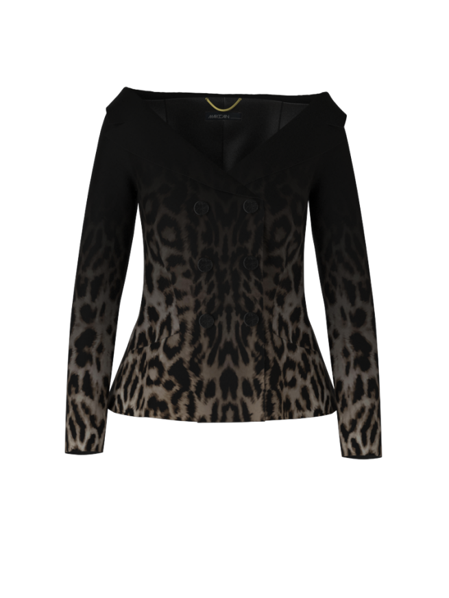 This blazer makes a bold statement with its dramatic off-shoulder design, showcasing an eye-catching modern interpretation of the leopard pattern in a rich dark gradient. Its figure-hugging silhouette is accentuated by a stylish double-breasted closure, while the soft material offers a slight stretch for comfort. This striking piece is perfect for those looking to elevate their ensemble with a touch of extravagance.