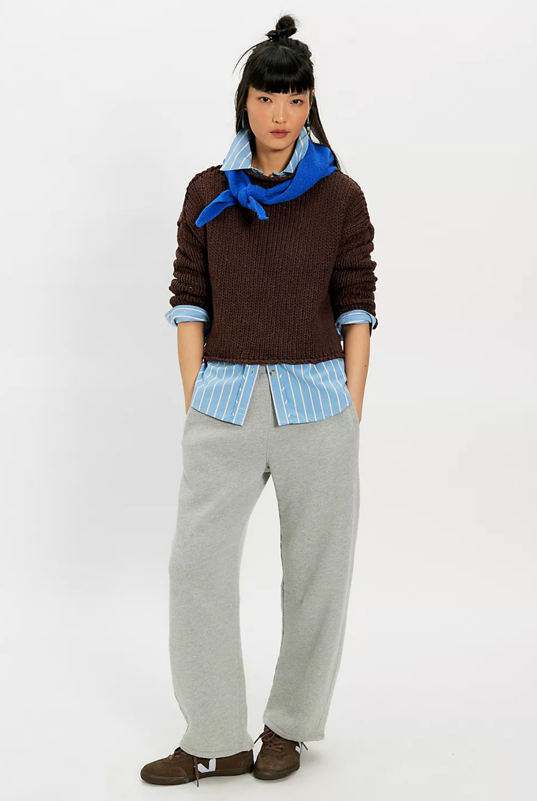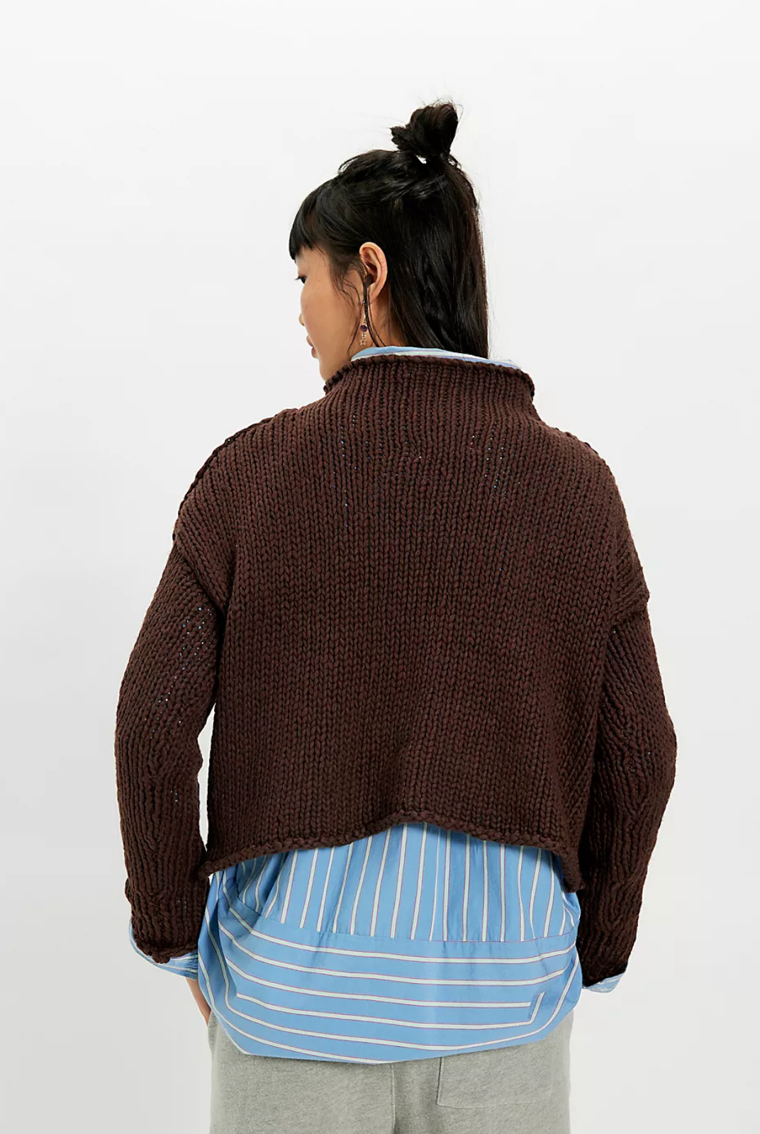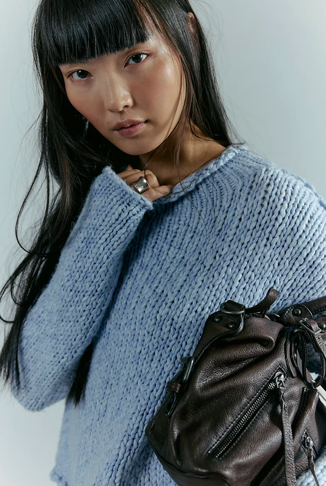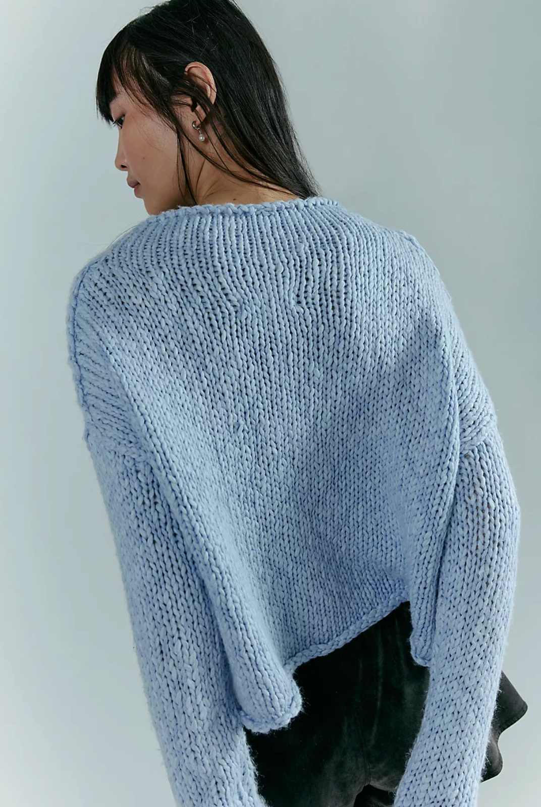 Designed for effortless ease, this knit features a rolled neckline and dropped shoulders that create an undone, laid-back silhouette. The boxy fit and light hand-feel make it perfect for everyday wear, whether styled with high-rise denim, relaxed trousers, or layered over a slip dress for a modern, off-duty look.