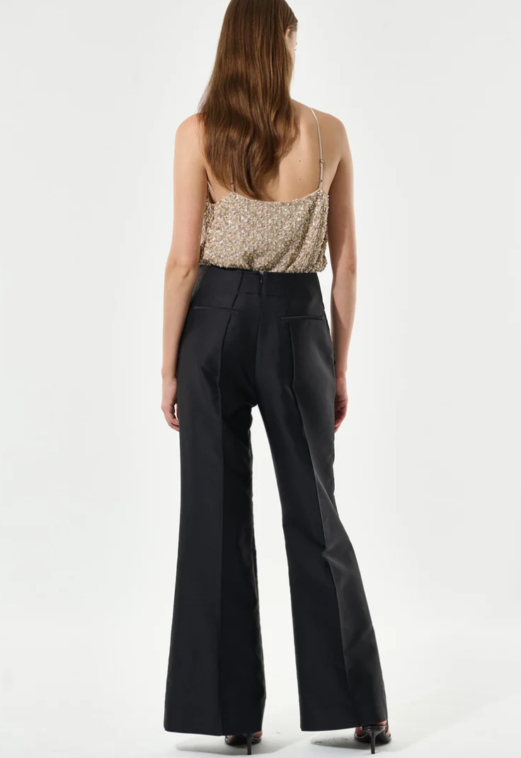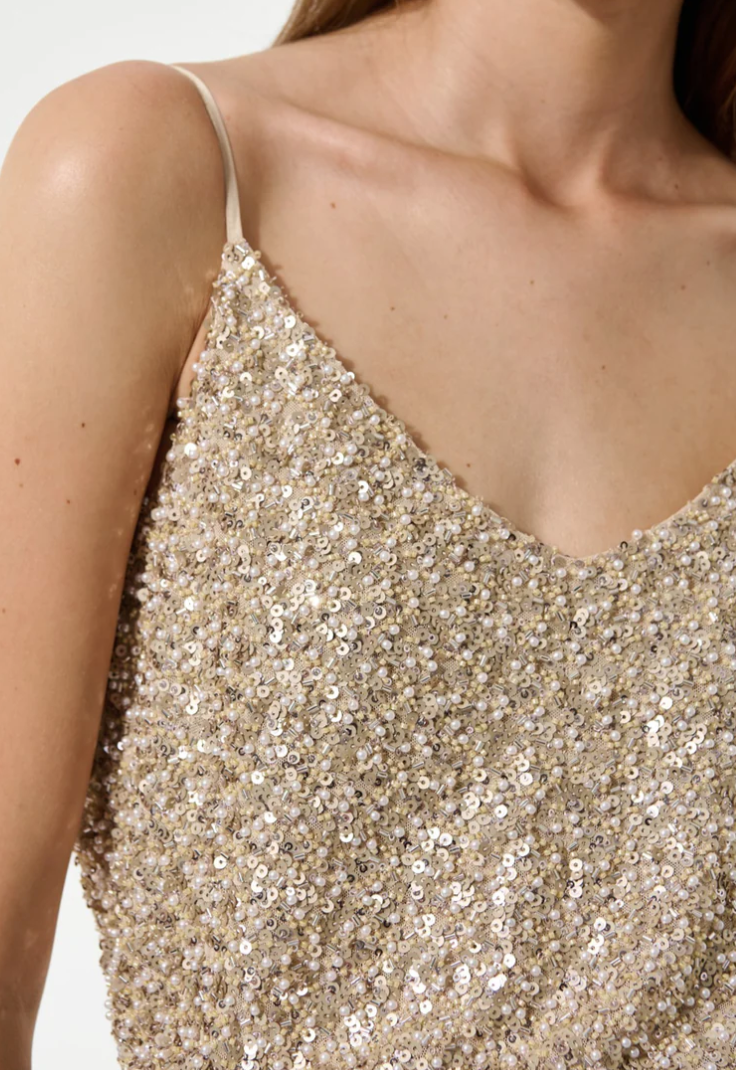 Add a touch of sparkle to your evening with this stunning mesh camisole top, completely covered in shimmering gold sequins, bugle beads, and seed pearls. Designed to catch the light from every angle, this top brings a luxurious, textured finish to your cocktail hour look. The form-fitting design is both flattering and dramatic, while adjustable straps ensure a personalized fit. Half-lined in mesh for a breathable feel, this top is the epitome of evening glamour.