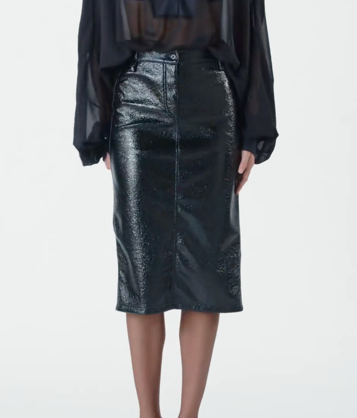 Striking and unapologetically bold, this calf-length coated jersey skirt brings biker attitude to evening dressing. The glossy, patent leather–effect finish offers sleek edge, while the soft interior keeps it comfortable enough for all-night wear. A rear slit adds movement and allure, and innovative ring belt loops invite styling with a skinny belt worn close to the body for added drama. Pair it with a fitted top and heeled boots to channel modern femininity—powerful, polished, and undeniably original.