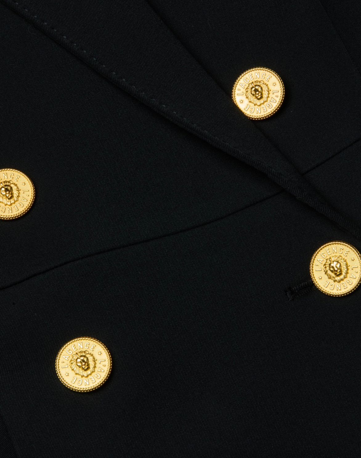 The Royalty dress reimagines classic tailoring with a feminine twist. Cut in dual stretch suiting fabric, this fit-and-flare silhouette features a sleek, structured bodice balanced by a softly flared skirt. Finished with bold lion head buttons and practical side pockets, it blends polish with playful charm.