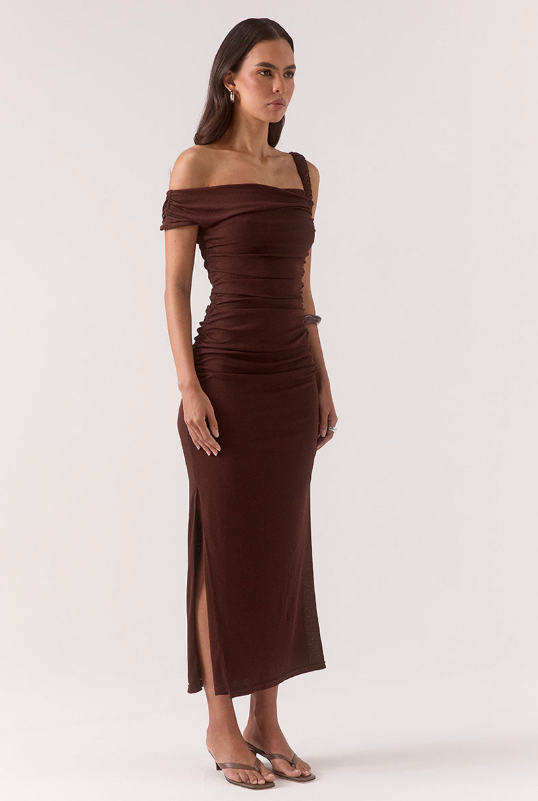 • Off-shoulder maxi dress silhouette