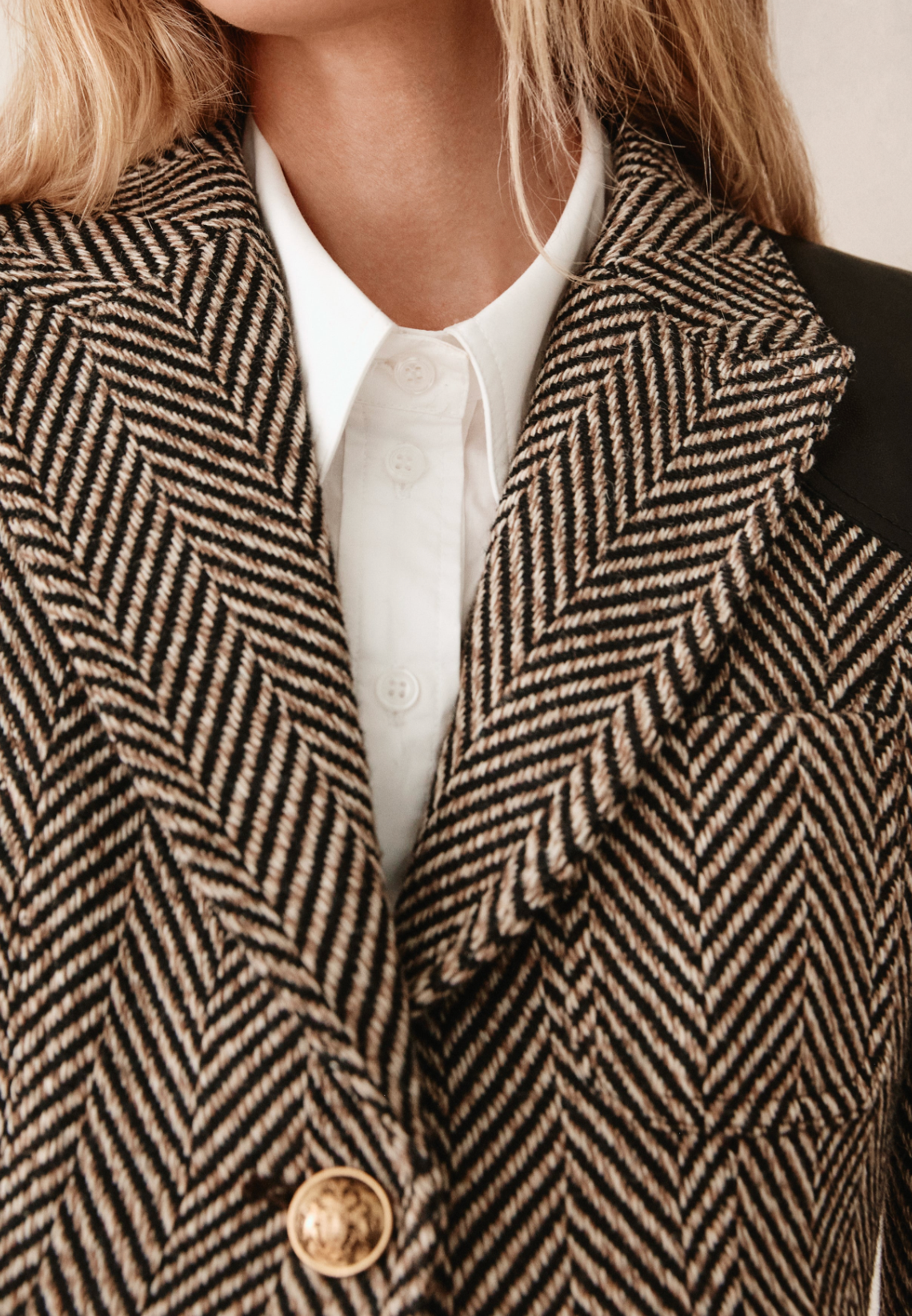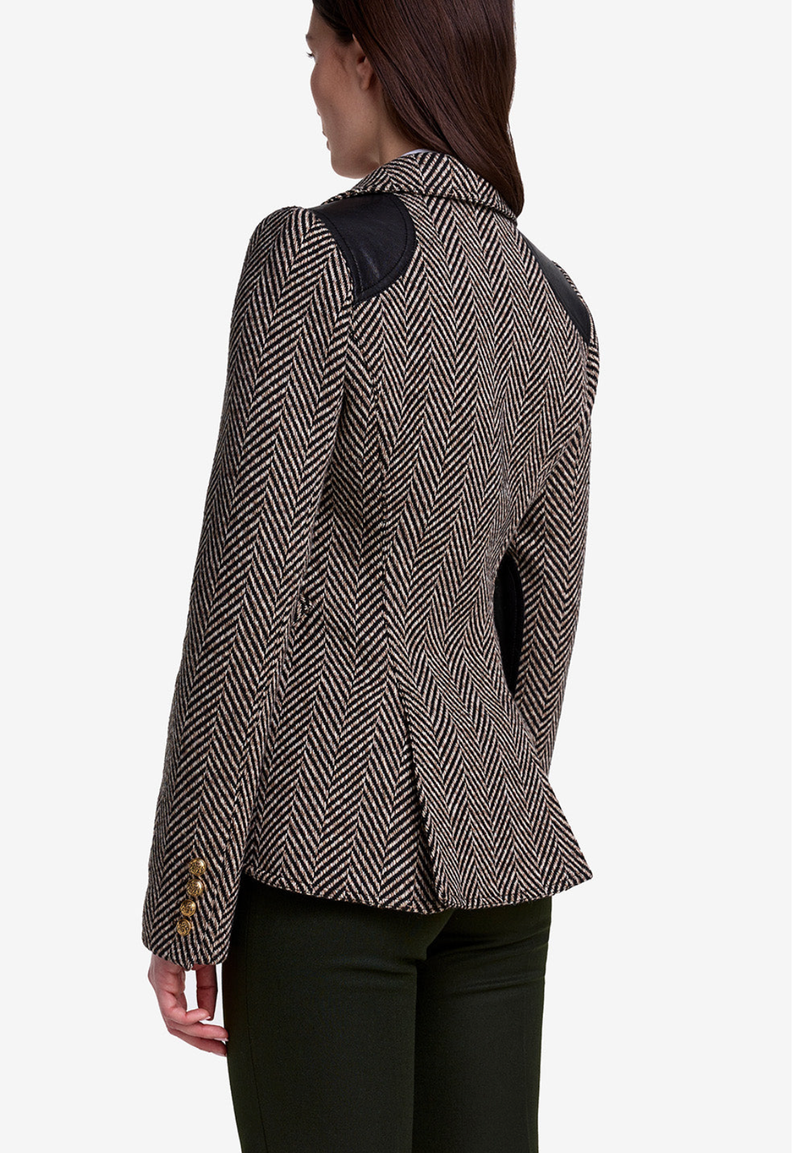 - Modern equestrian styling with leather saddle patches on forearms