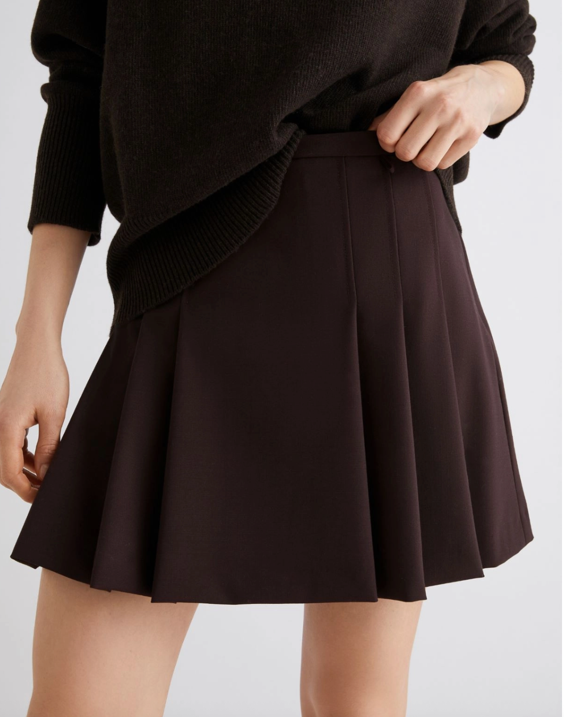 Designed in a stretch wool-blend canvas, this lined skirt balances tailored elegance with sporty structure. Featuring sharp front pleats that subtly open toward the hem, it’s finished with a matching fabric belt and concealed side zip for a clean, polished look.