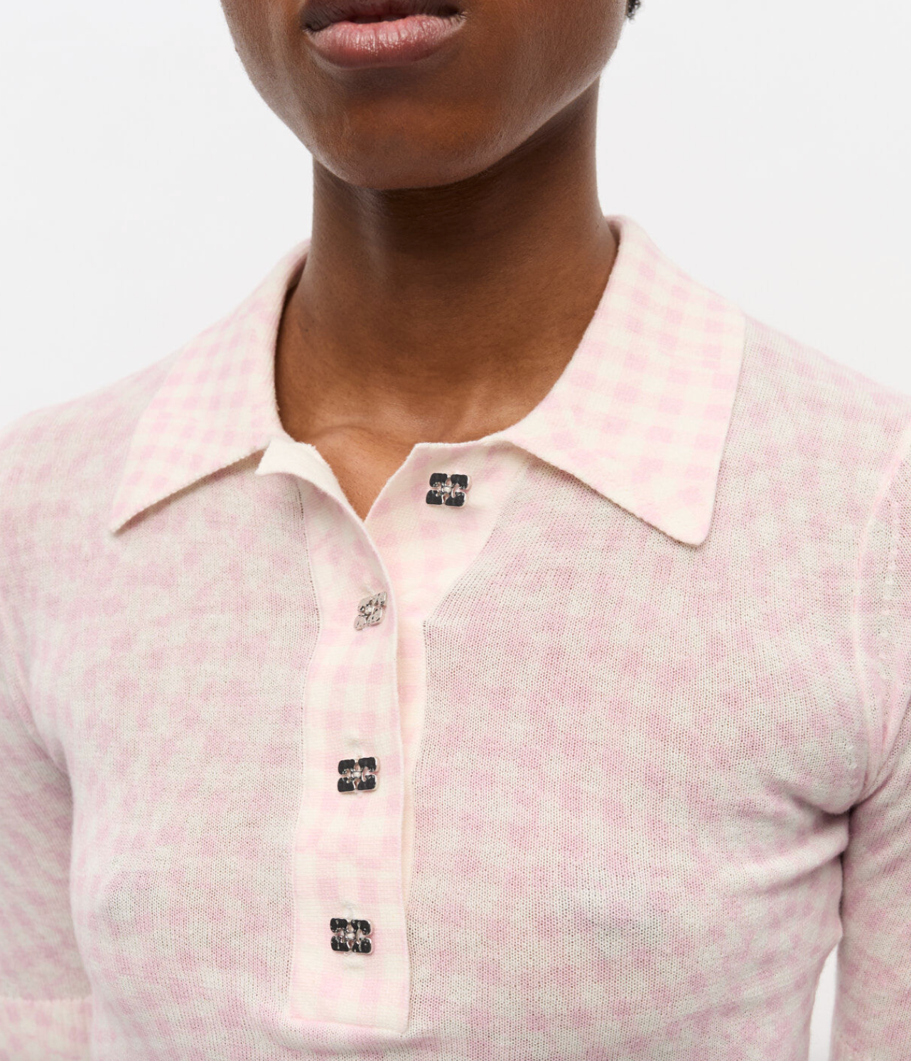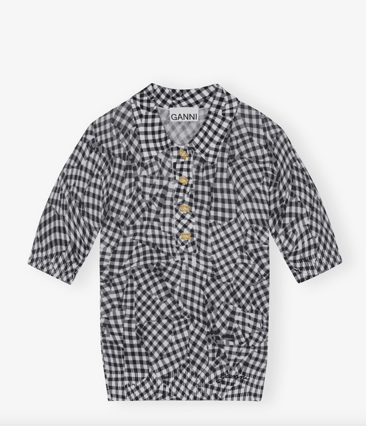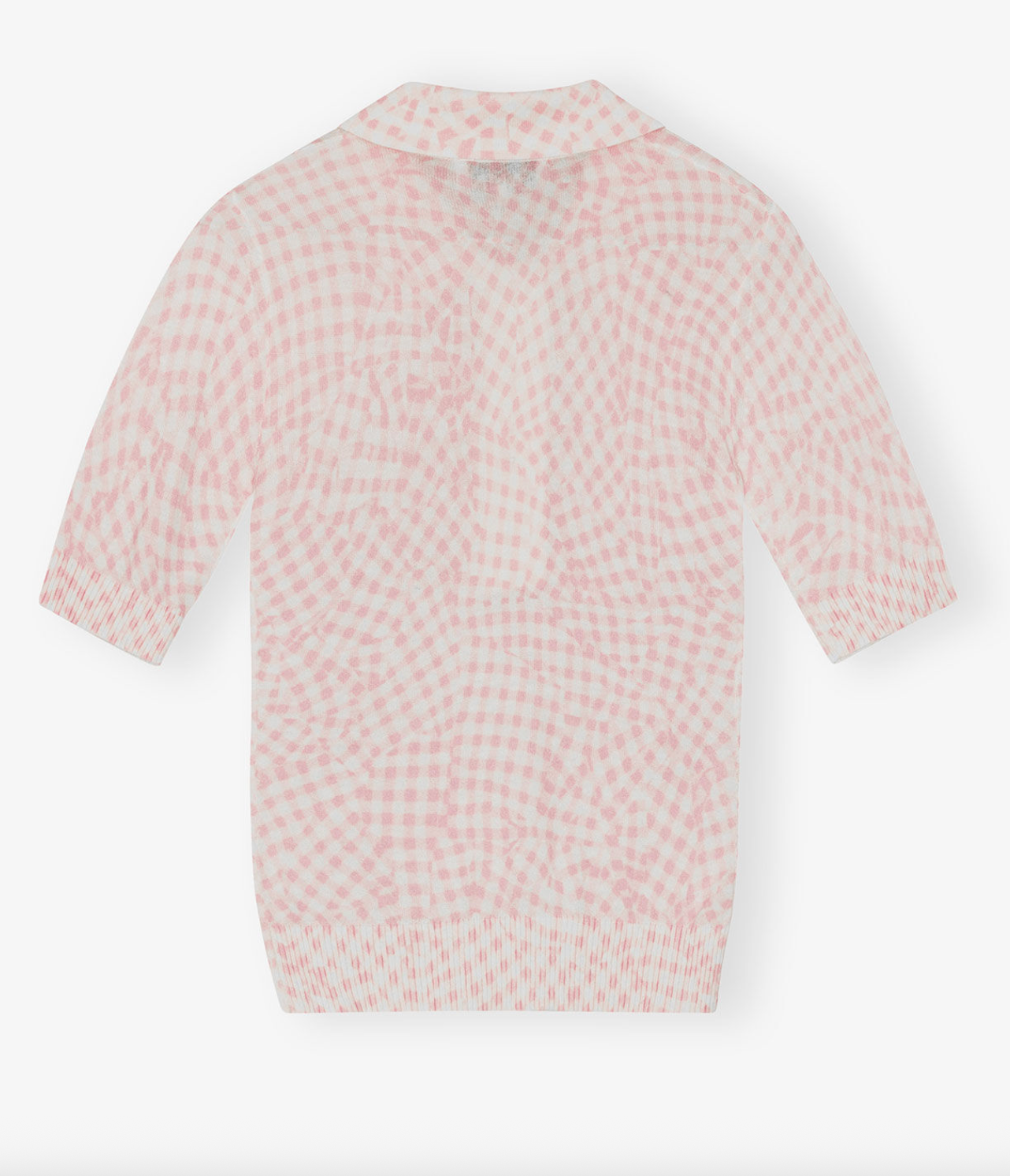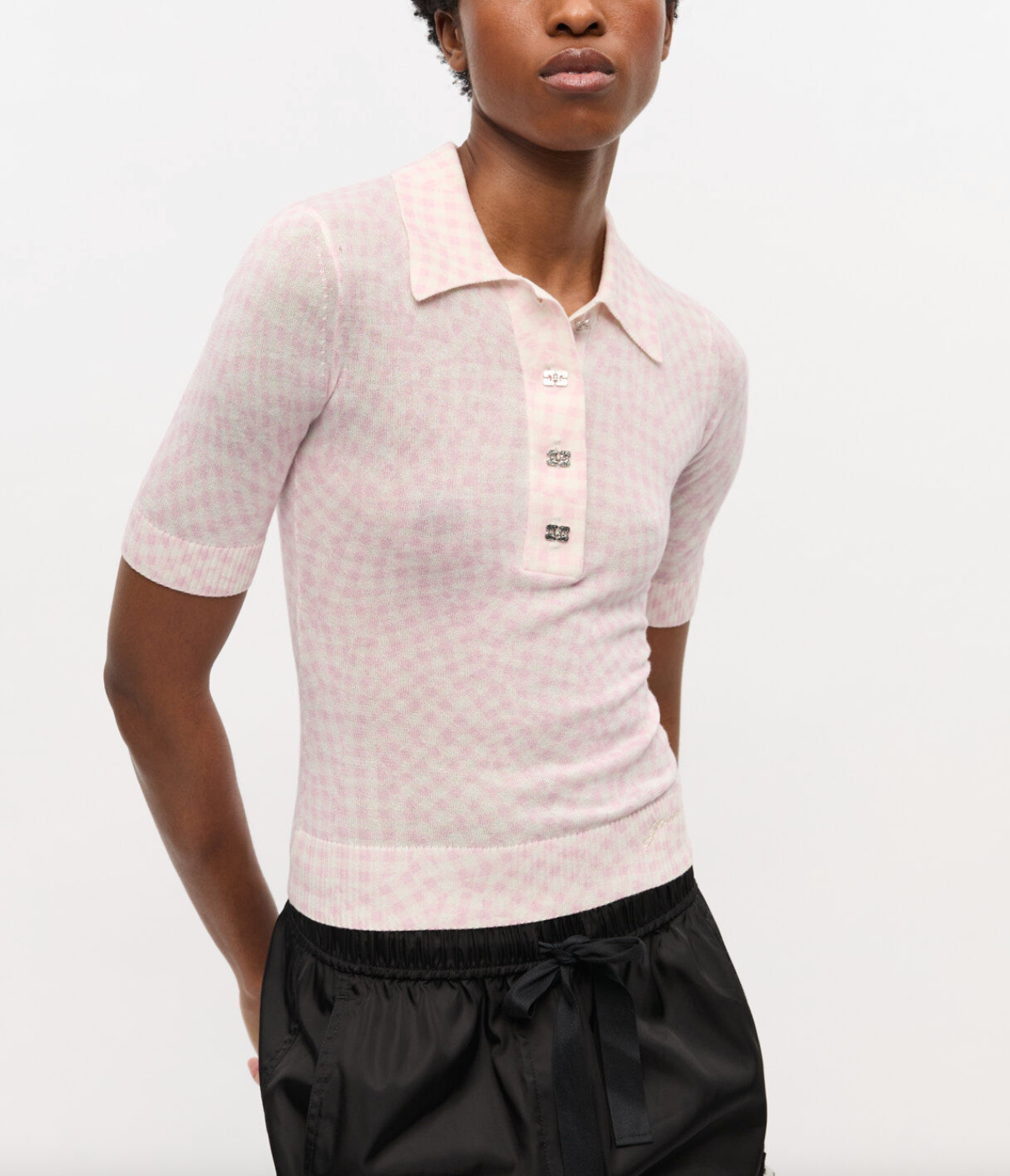 Crafted with a bold check pattern, this knit polo features a pointed collar, silver-tone button front, and short sleeves. Ribbed edges and an embroidered GANNI logo complete the sporty-meets-chic look.