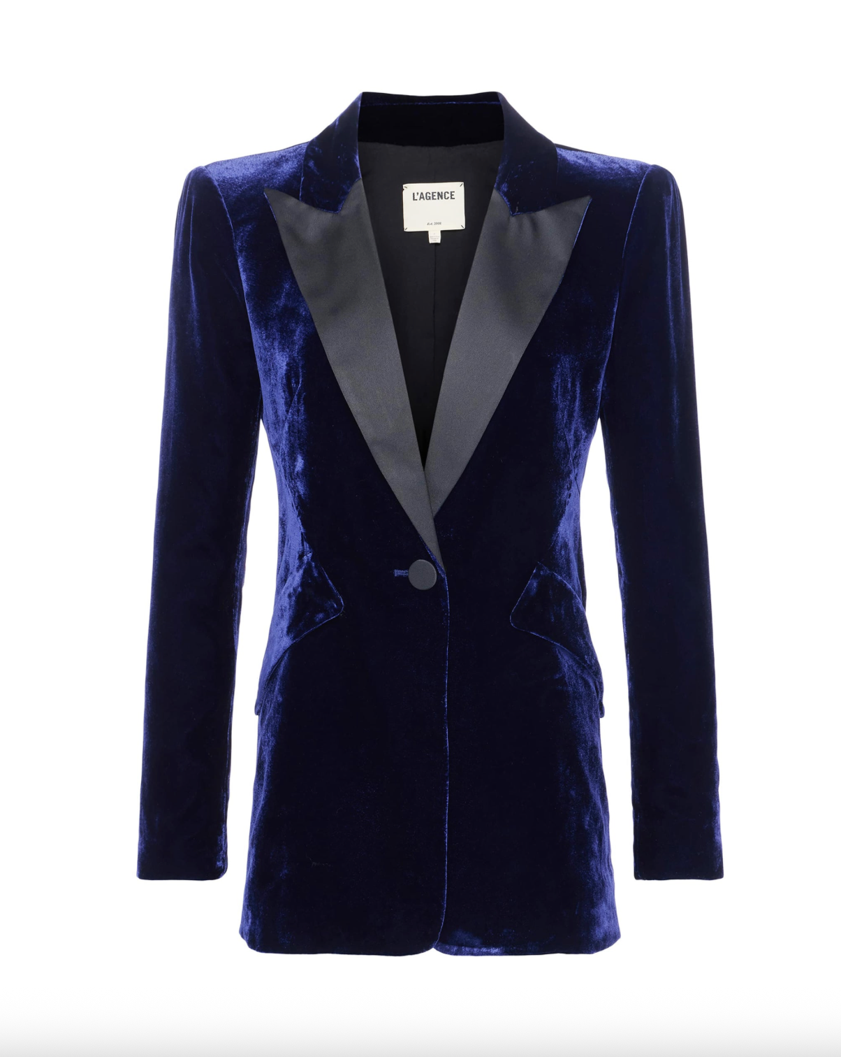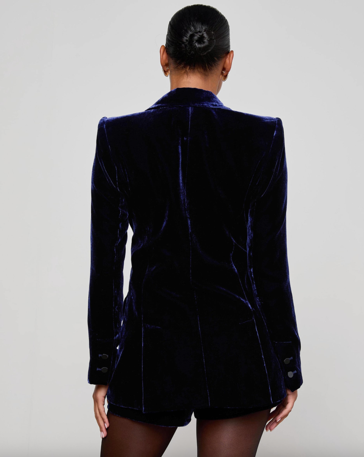 A bold, modern take on the classic tuxedo, this jacket is cut from silk-infused midnight-blue velvet with contrasting satin lapels. Balancing masculine structure with a subtly feminine fit, it delivers effortless elegance and refined polish. Designed to hit below the hip, its long lines create a sleek, streamlined silhouette ideal for power dressing with a contemporary edge.