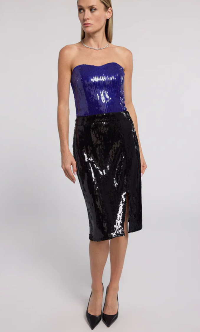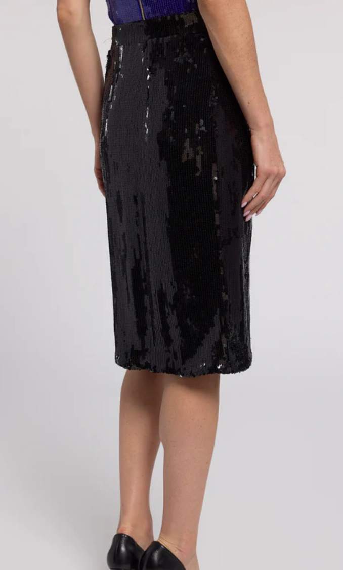 Turn heads with this striking black sequin skirt, designed for those who love to shine. Featuring a mid-rise fit, this skirt flatters the waist while offering a chic, modern silhouette. The black sequin fabric catches the light with every movement, creating a bold yet sophisticated look that's perfect for both evening events and a night out with friends. The side zipper adds a sleek, seamless finish, while the diagonal slit just below the knee offers a hint of daring edge, making this skirt as stylish as it is versatile. Whether paired with a blouse for a polished look or dressed down with a casual top, this skirt is an essential piece for anyone looking to add a touch of sparkle to their wardrobe.
