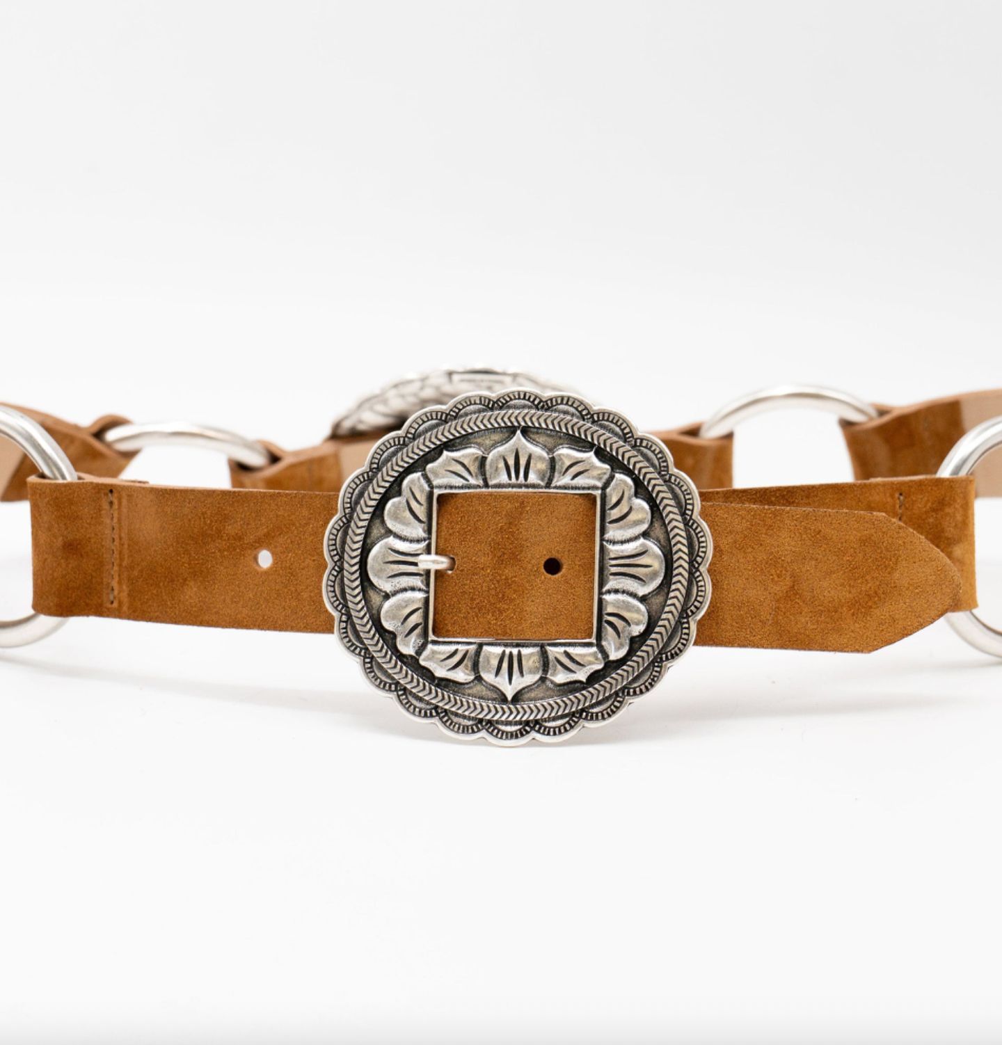 The Lilienne Belt brings romantic western flair to a timeless silhouette. Crafted from rich Italian suede and finished with an ornate, floral-engraved brass-plated buckle set, it balances rugged charm with refined detailing. A statement accessory that elevates any look.