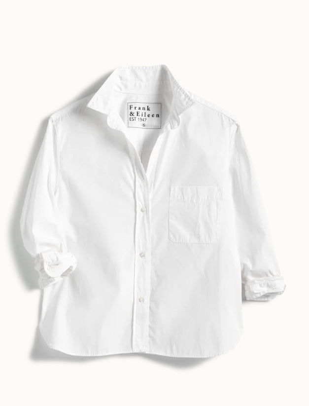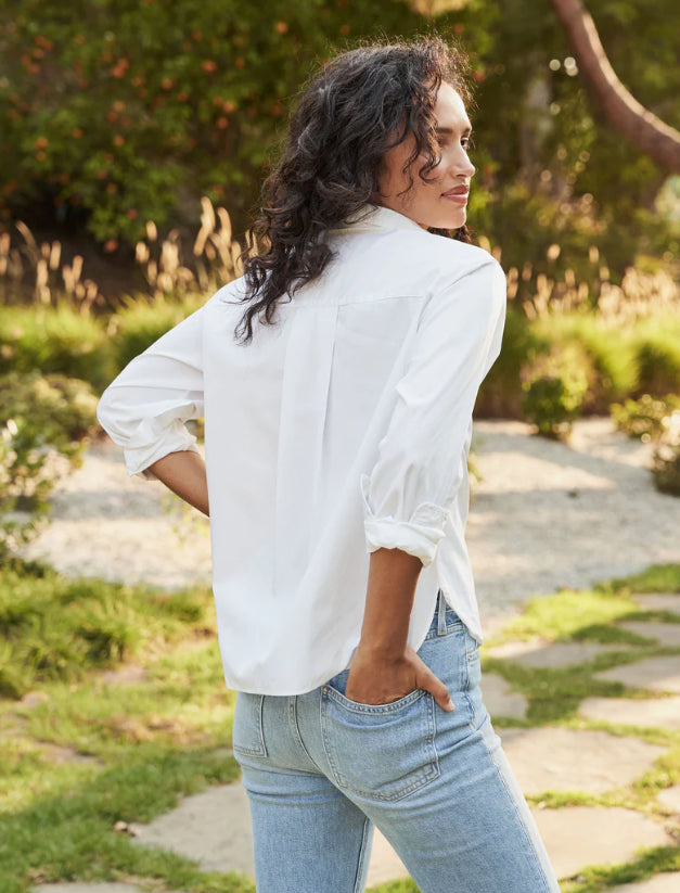 - A petite square fit button-up with a center back pleat and oversized envelope pocket