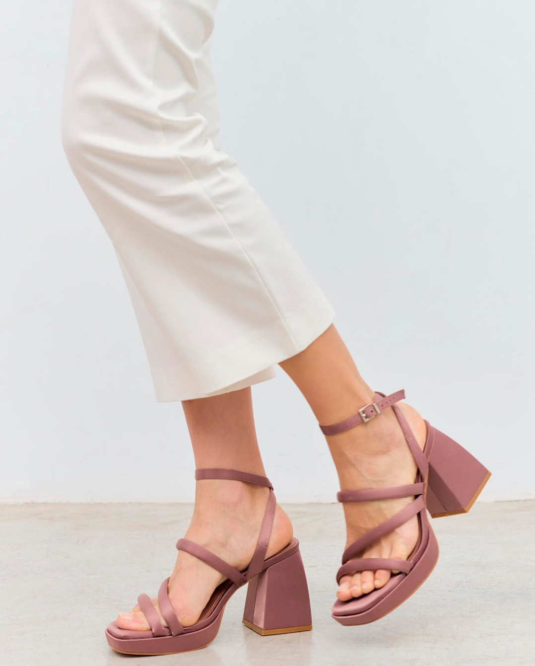 Elevate your evening look with the Celeste Tubular Strap Heel, a sophisticated sandal crafted in dreamy mauve satin. Featuring a modern square heel and multiple tubular front straps, this design strikes the perfect balance of bold and feminine. The ankle bracelet-style strap wraps the ankle with grace, secured by a polished metal buckle for a secure fit. From formal events to stylish date nights, this heel brings a refined finish to any outfit.