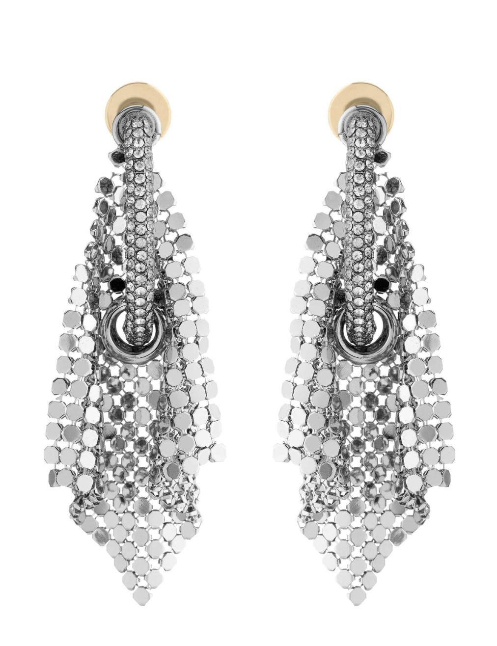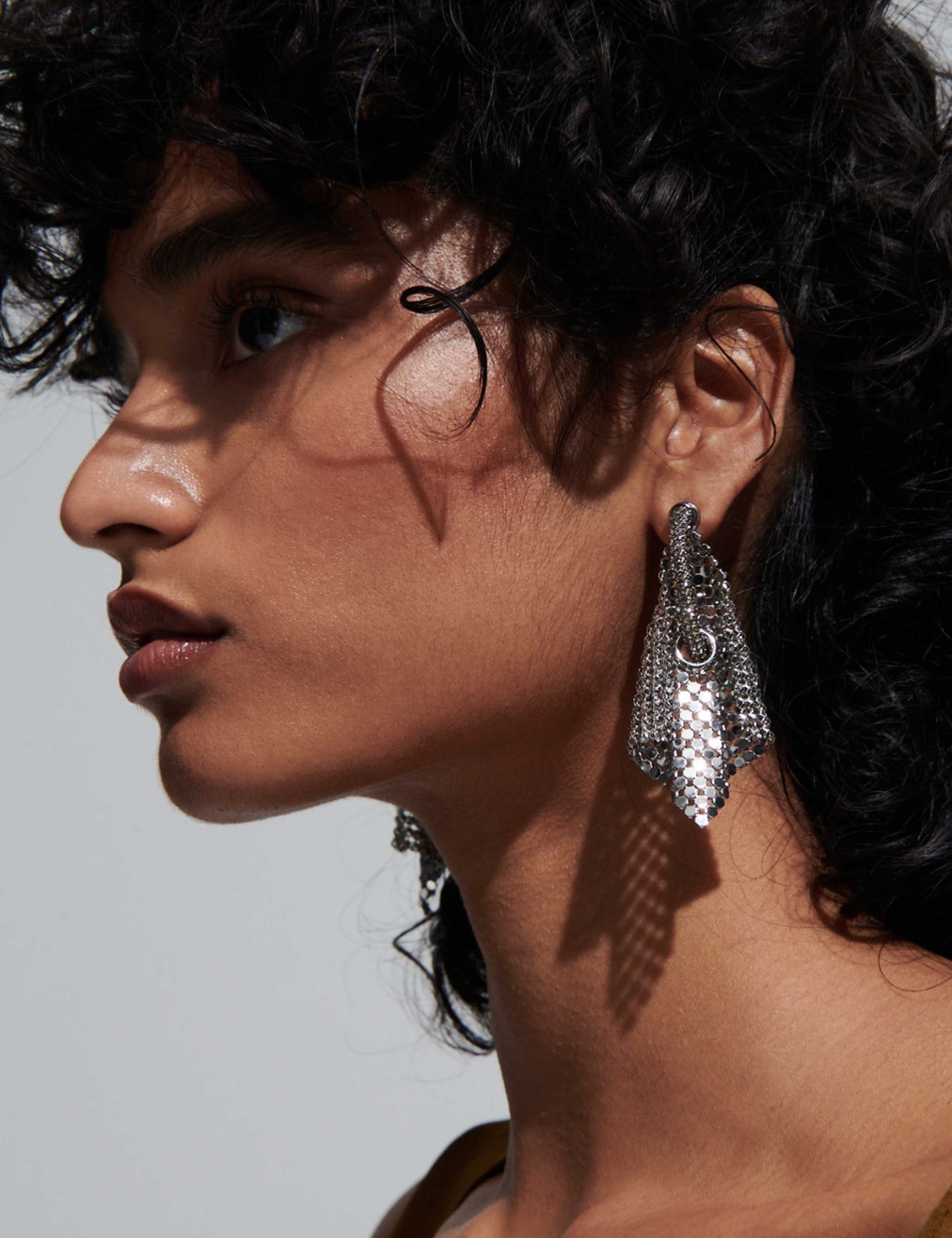 These Shiny Silver Chainmail Earrings make an unforgettable statement with their bold post design and flowing chainmail details. The encrusted pave hardware adds an extra touch of sparkle, making them the perfect accessory to elevate both day and night looks. Whether worn with a casual tee for a chic edge or paired with an evening dress for a show-stopping finish, these earrings are versatile enough to complement any outfit.
