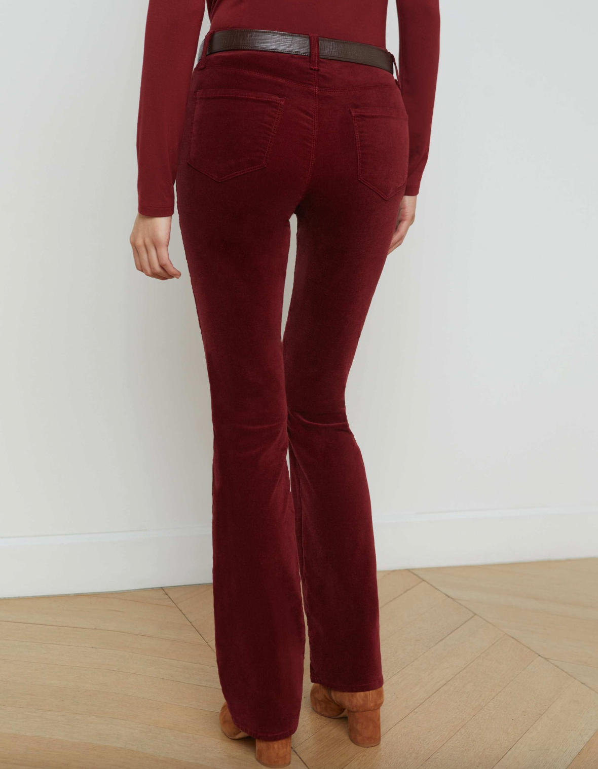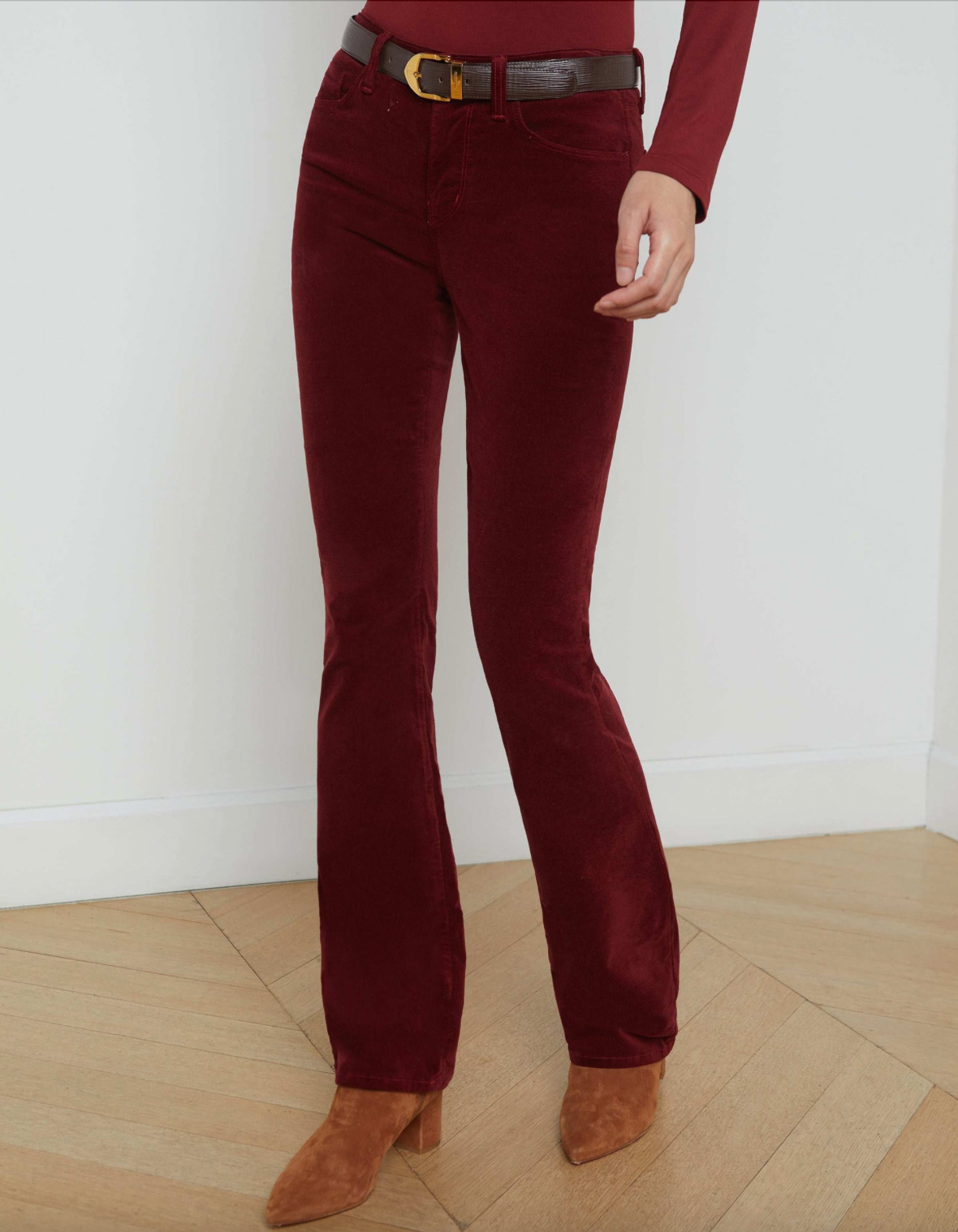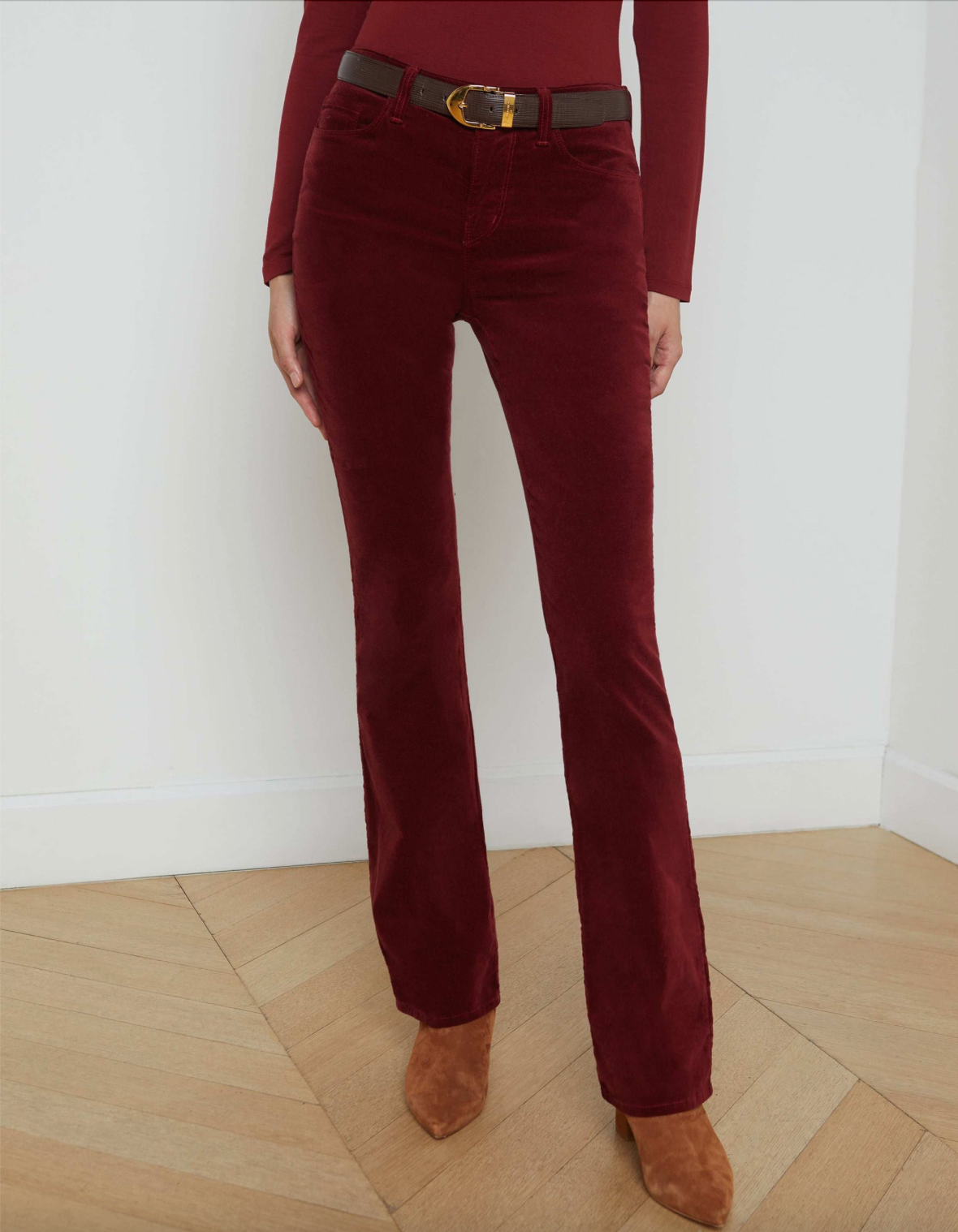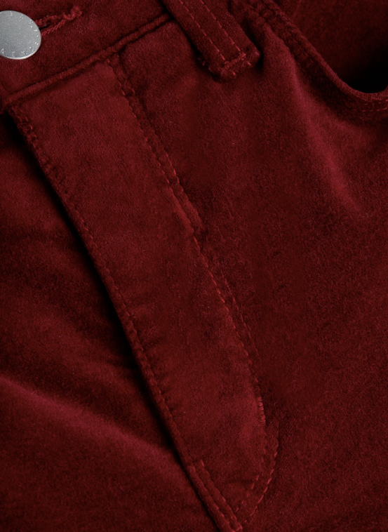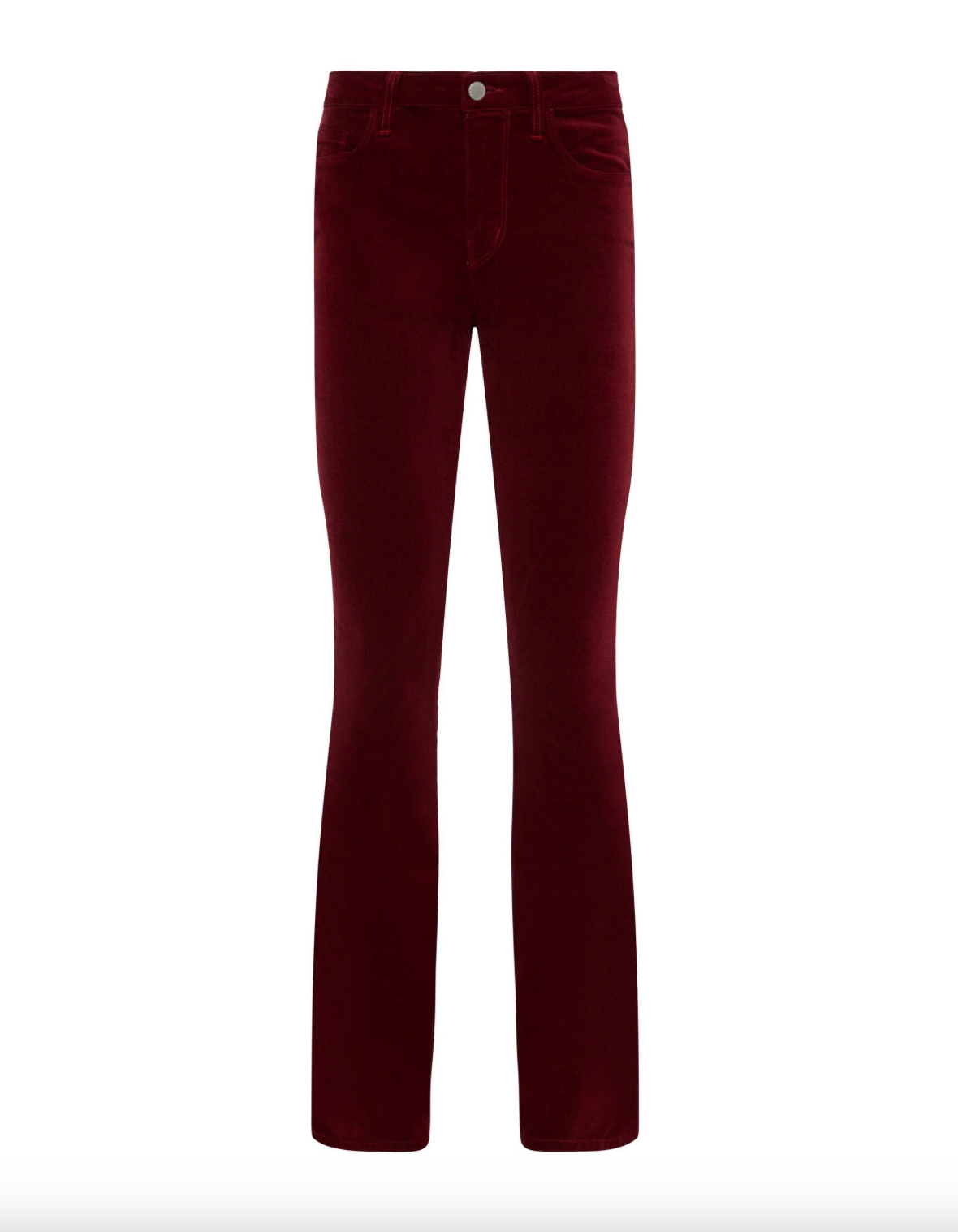 An elevated slim straight-leg high-rise jean in a luxurious velvet stretch denim and black-cherry-red hue. Contoured waistband smooths and slims the natural waist, while velvet stretch denim hugs hip, thigh and knee before releasing to a straight leg. Includes five-pocket construction and front zip fly closure.