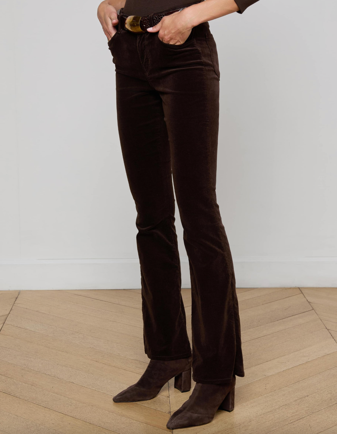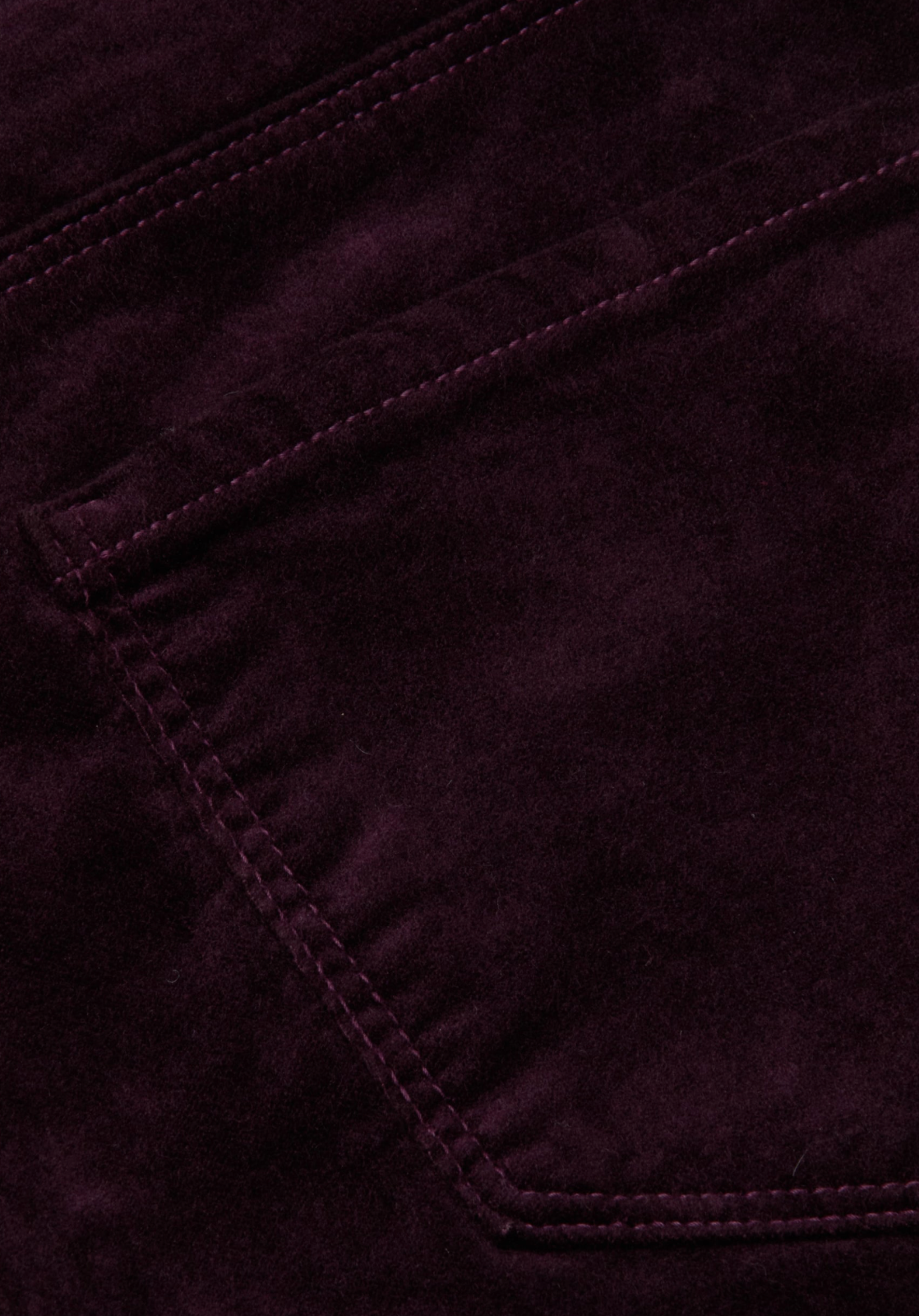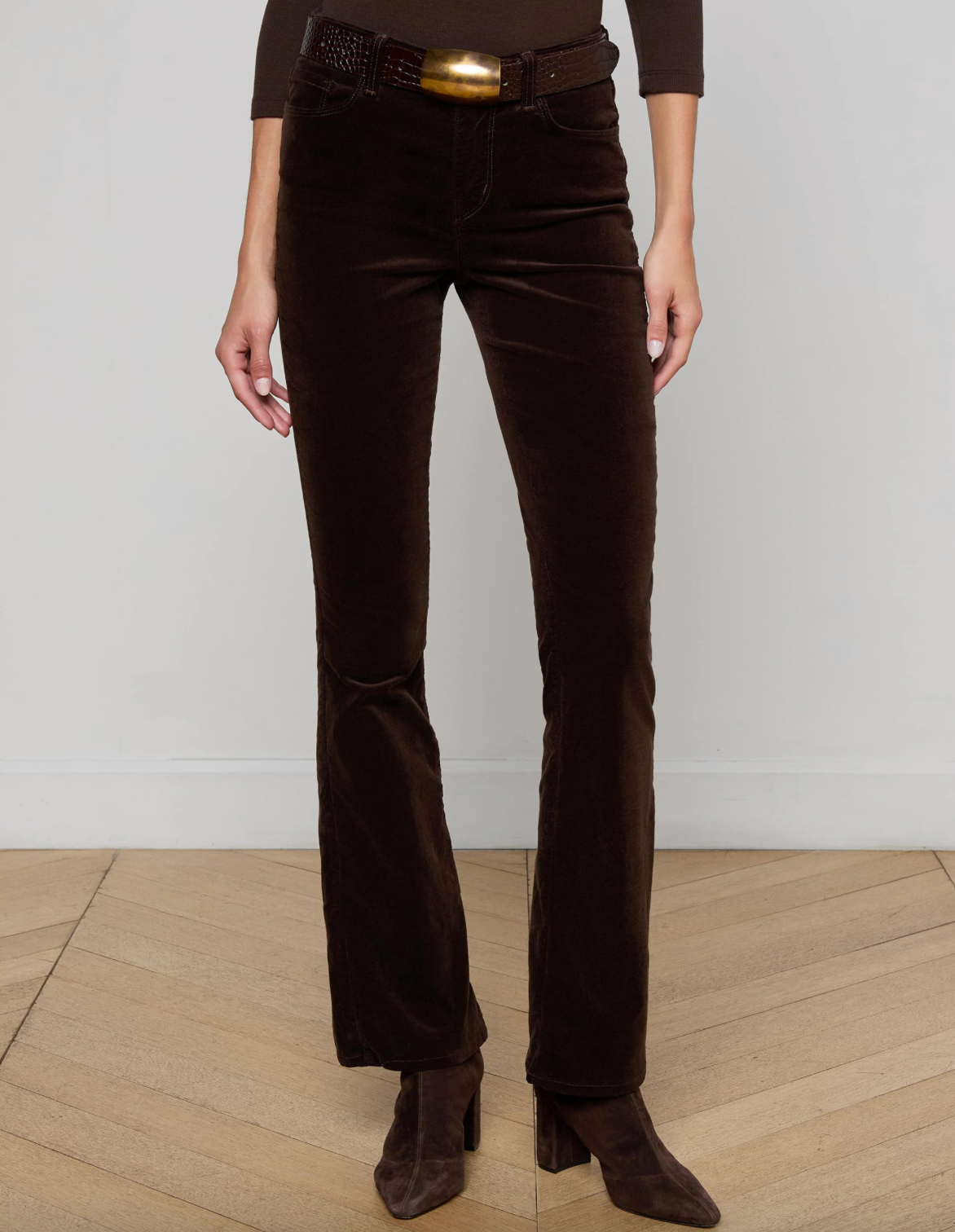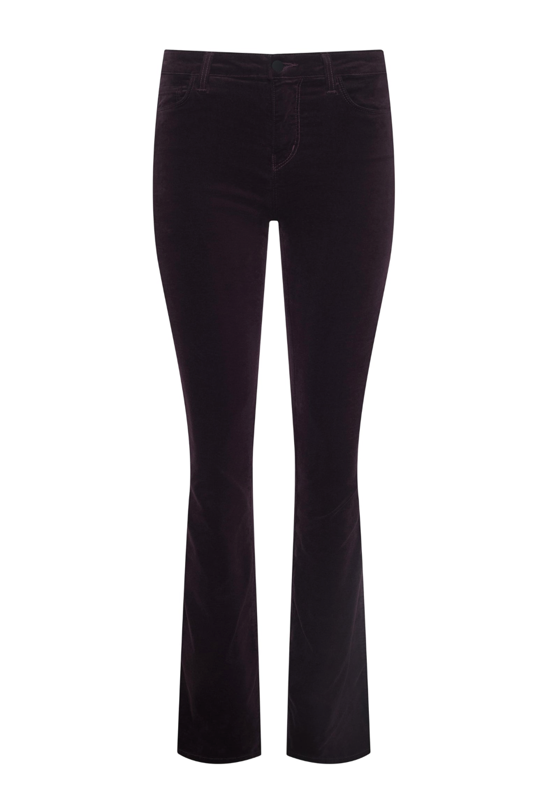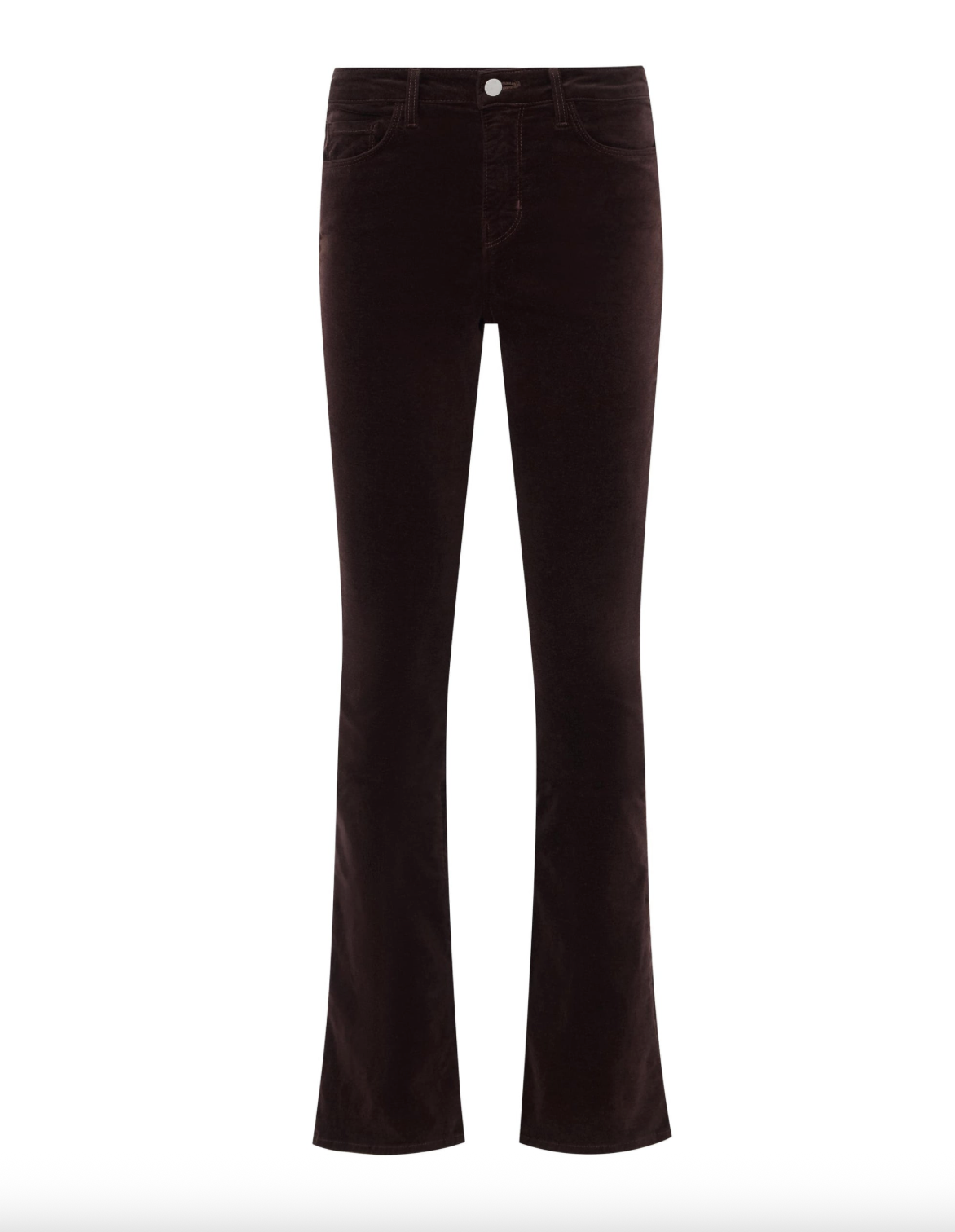An elevated slim straight-leg high-rise jean in a luxurious velvet stretch denim and black-cherry-red hue. Contoured waistband smooths and slims the natural waist, while velvet stretch denim hugs hip, thigh and knee before releasing to a straight leg. Includes five-pocket construction and front zip fly closure.
