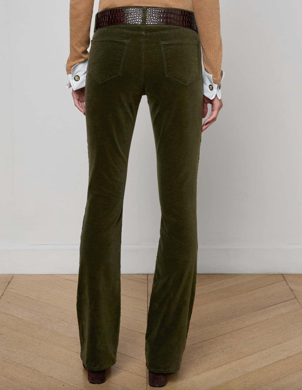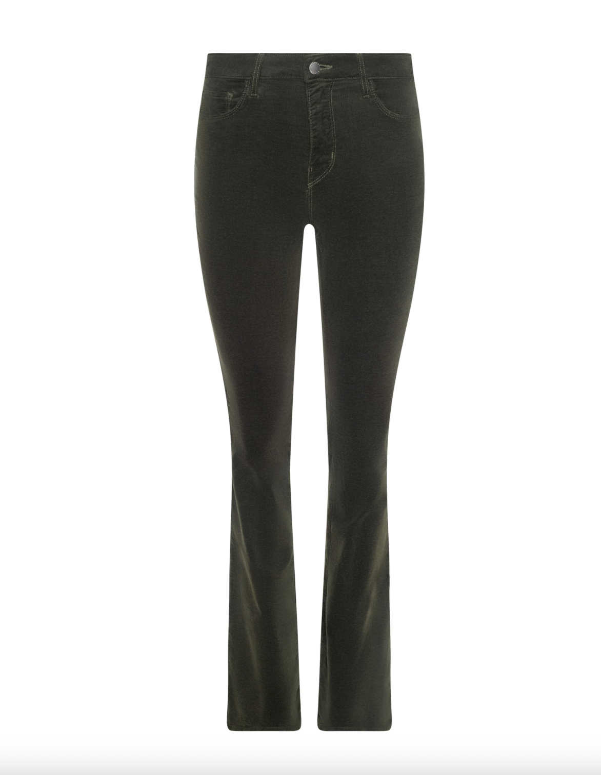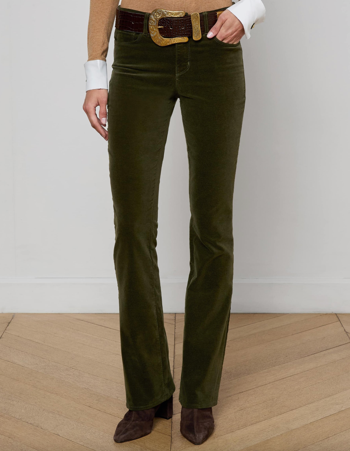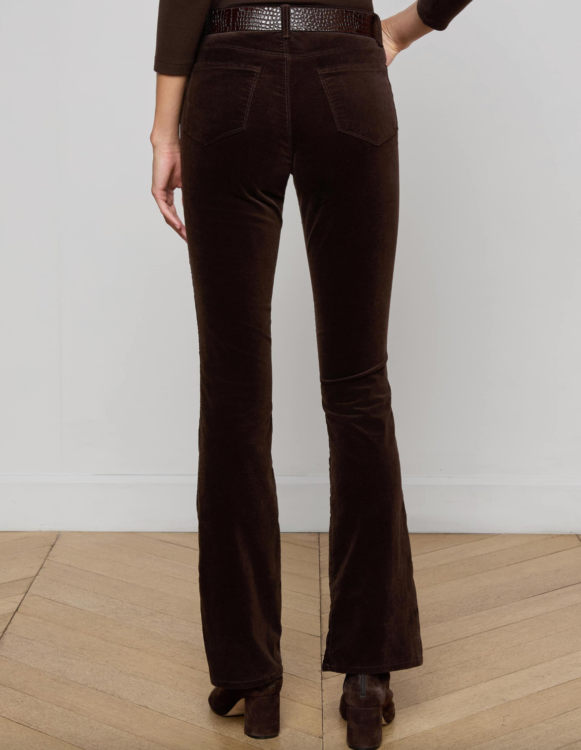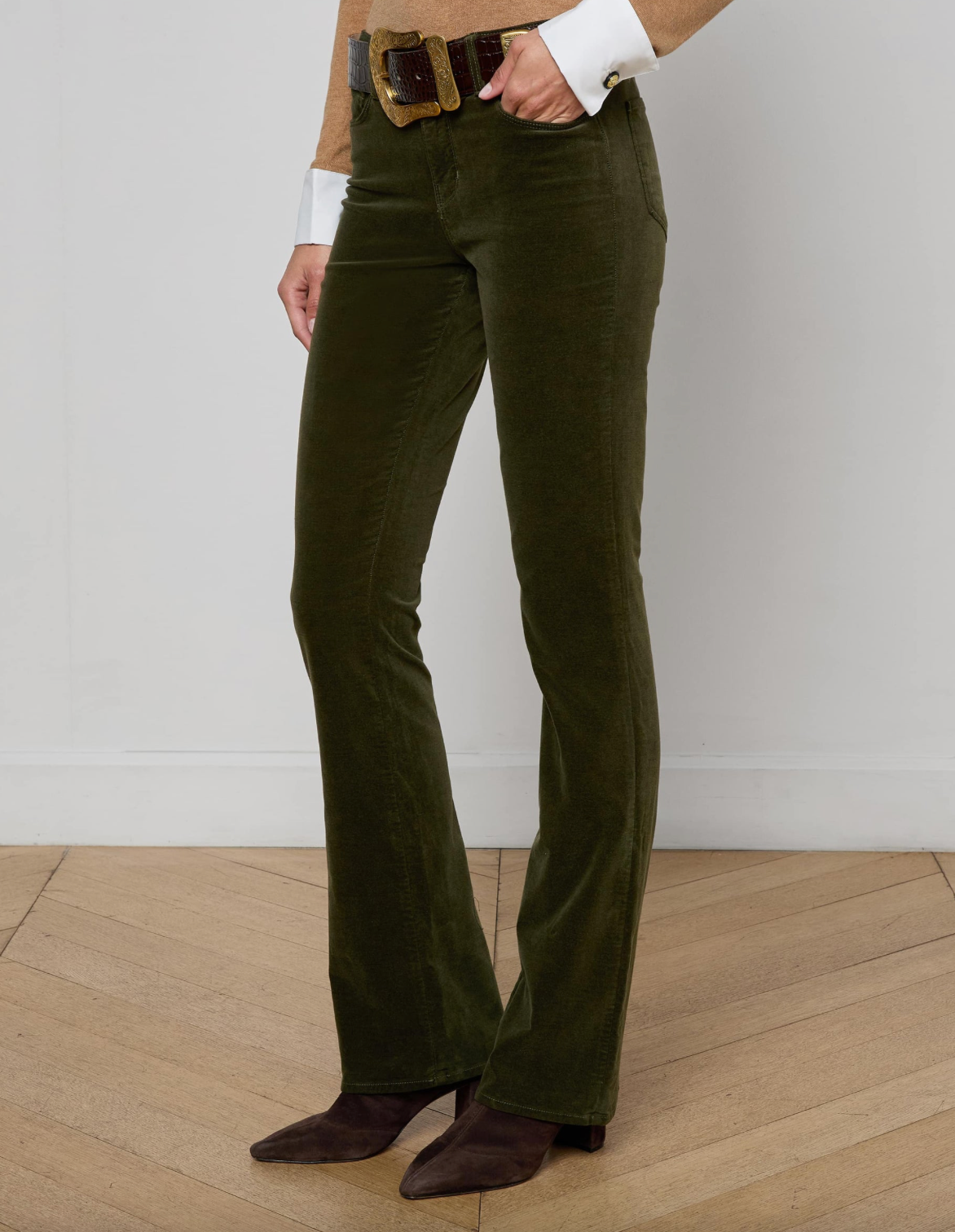 An elevated slim straight-leg high-rise jean in a luxurious velvet stretch denim and black-cherry-red hue. Contoured waistband smooths and slims the natural waist, while velvet stretch denim hugs hip, thigh and knee before releasing to a straight leg. Includes five-pocket construction and front zip fly closure.
