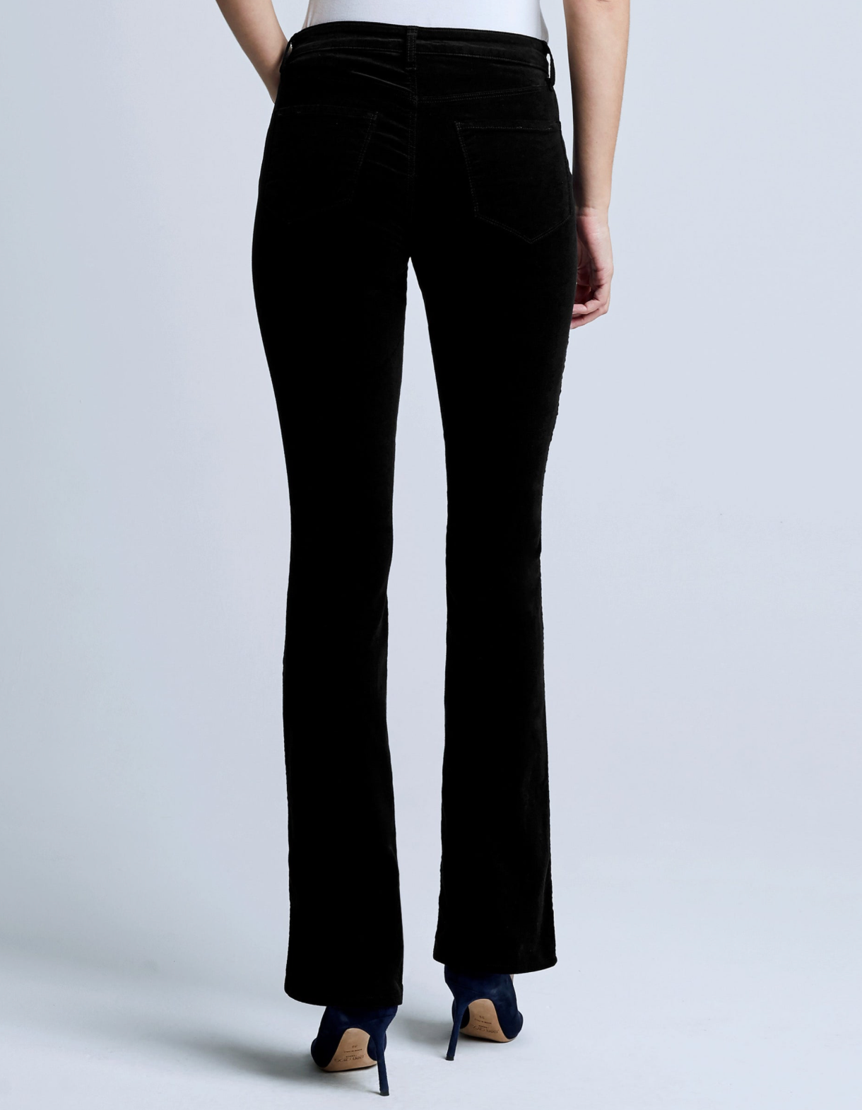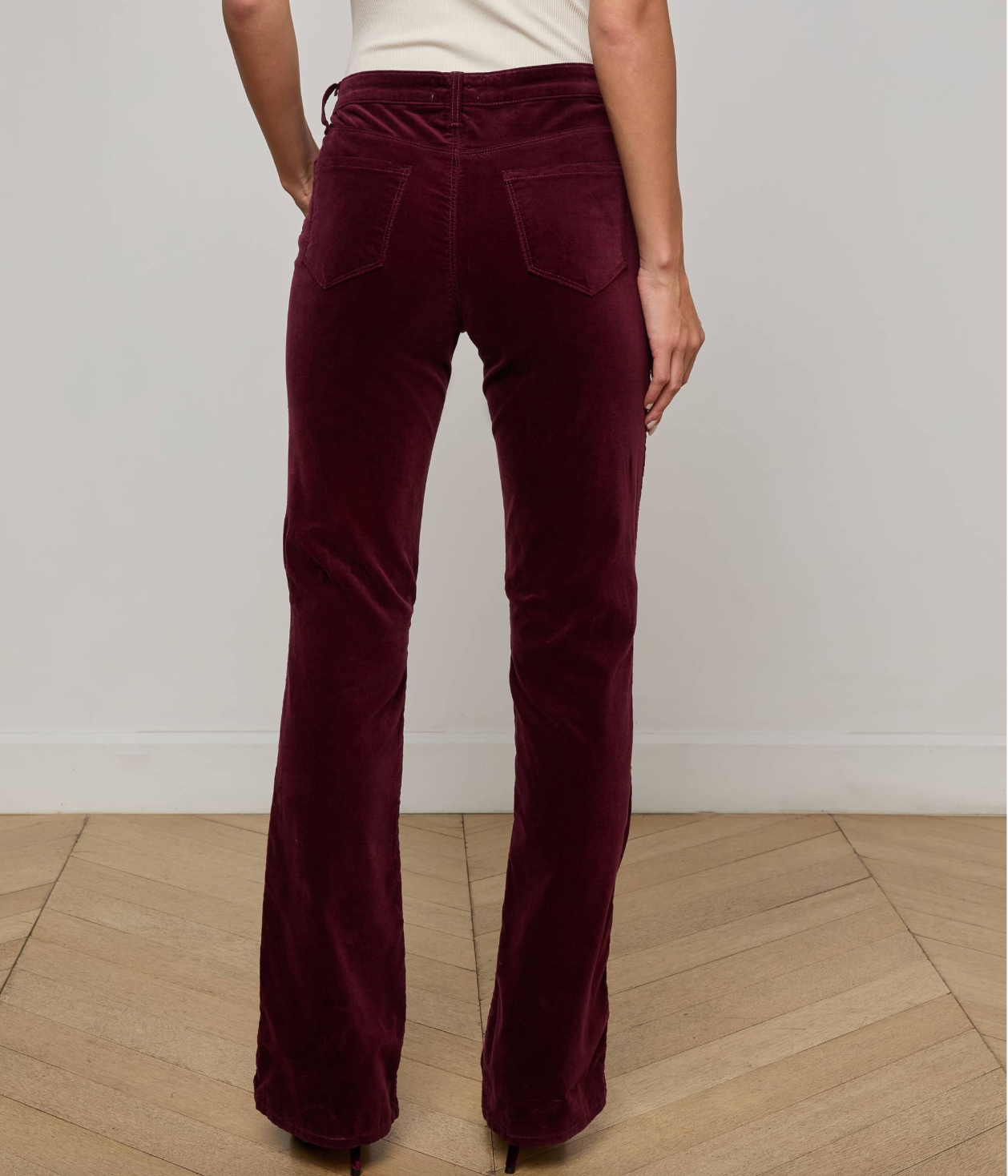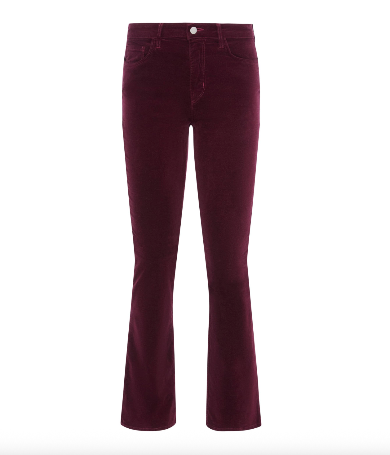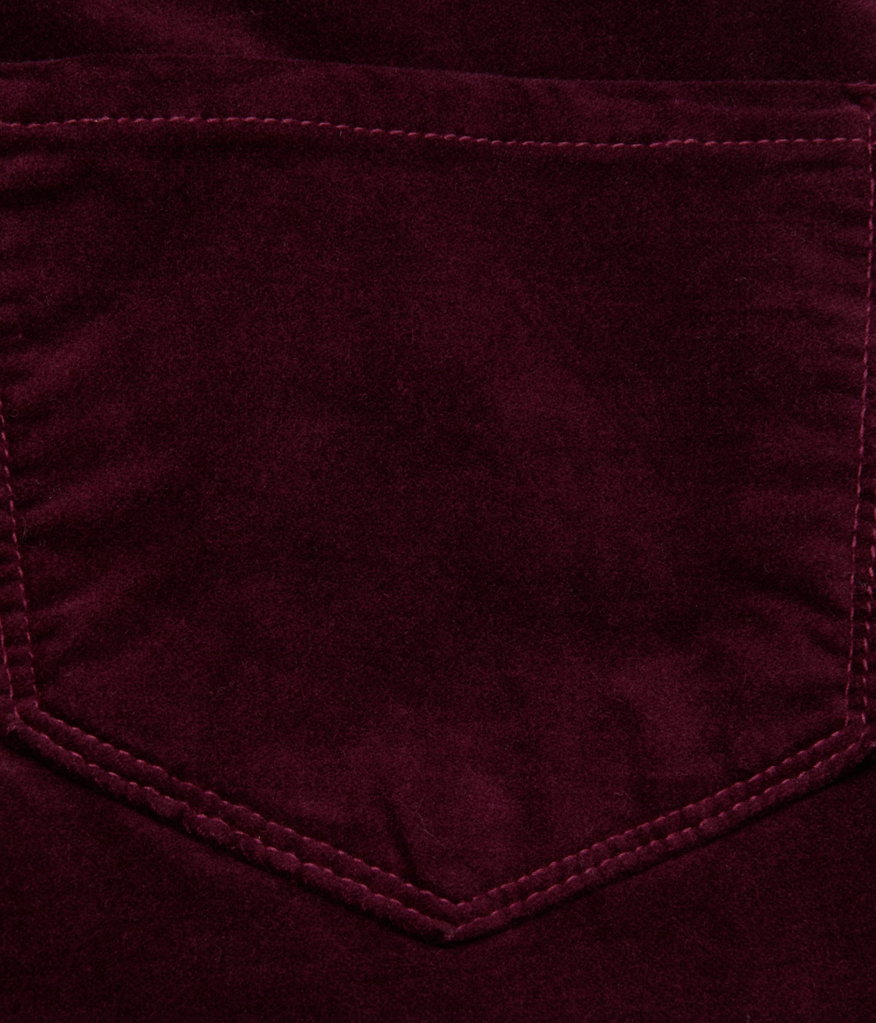 An elevated slim straight-leg high-rise jean in a luxurious velvet stretch denim and black-cherry-red hue. Contoured waistband smooths and slims the natural waist, while velvet stretch denim hugs hip, thigh and knee before releasing to a straight leg. Includes five-pocket construction and front zip fly closure.
