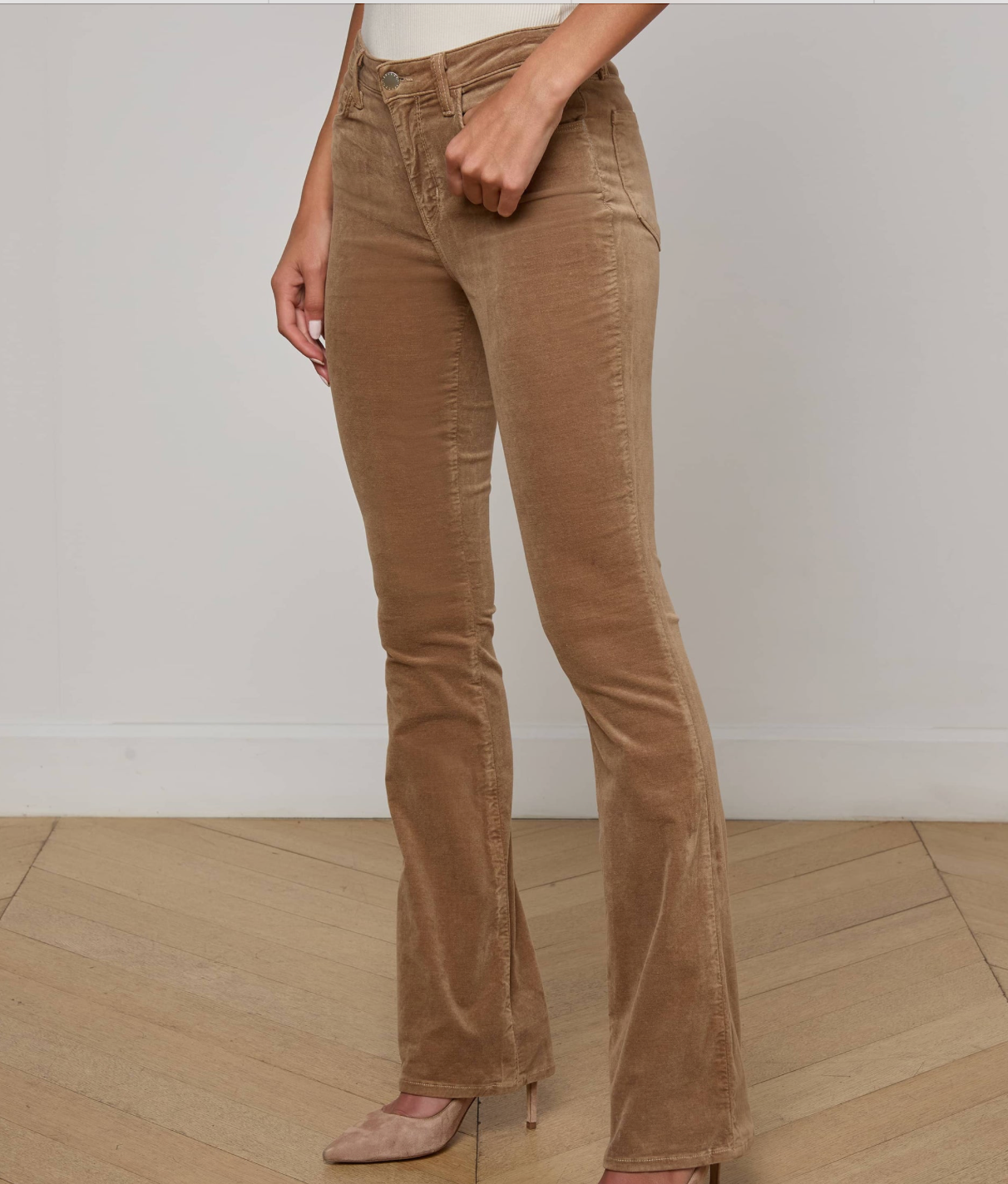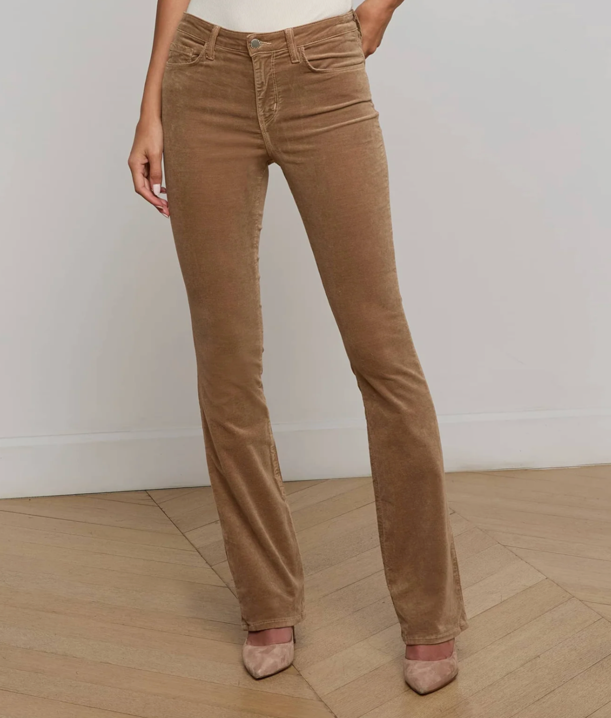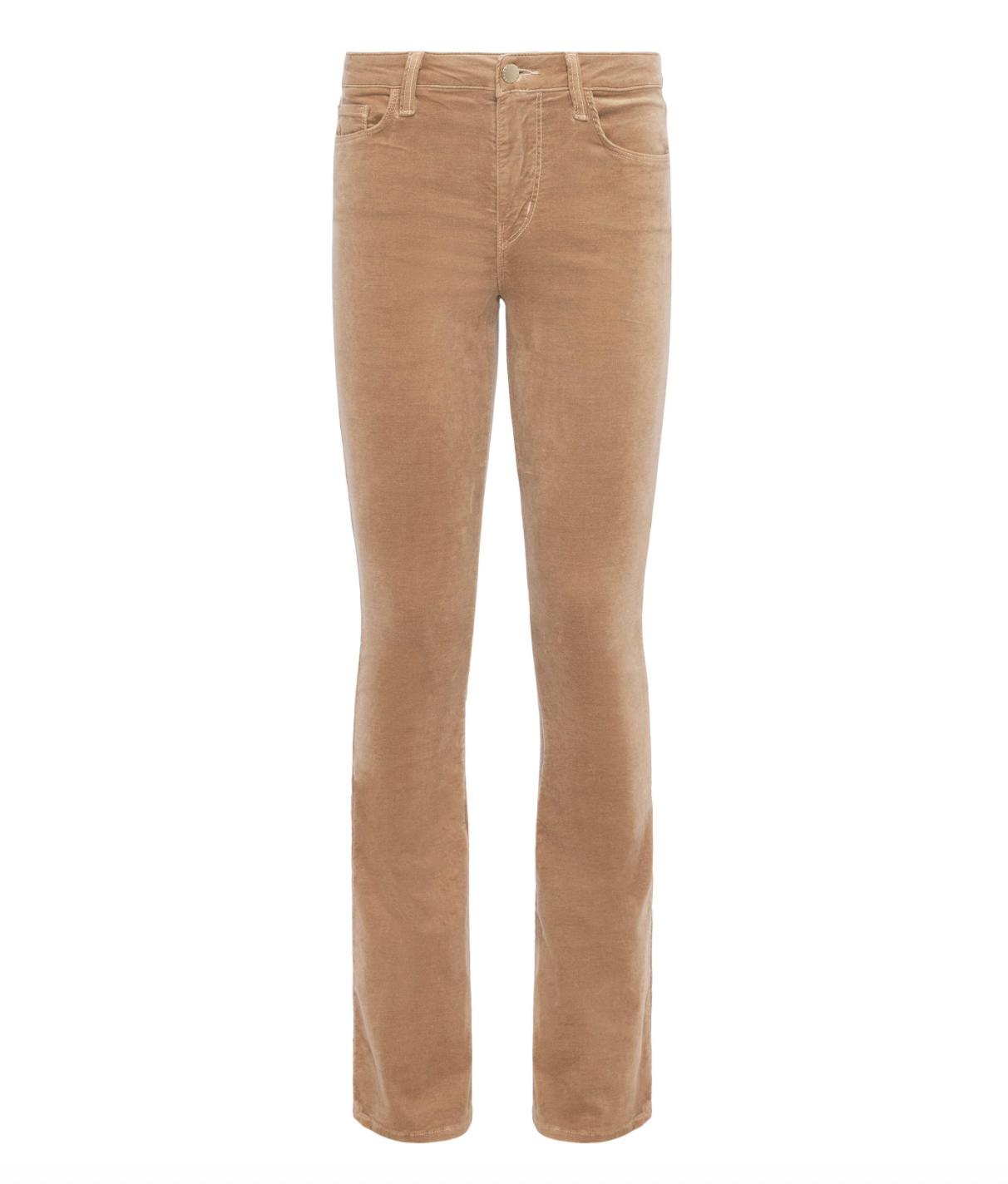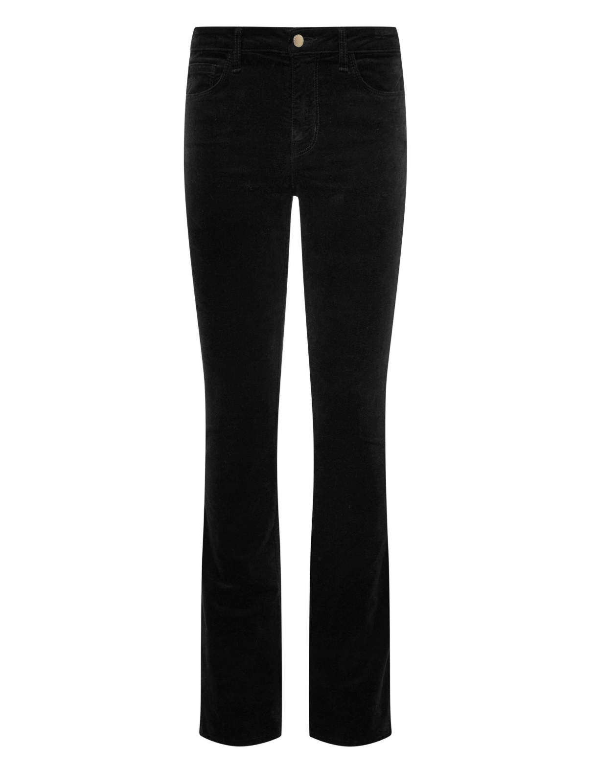 An elevated slim straight-leg high-rise jean in a luxurious velvet stretch denim and black-cherry-red hue. Contoured waistband smooths and slims the natural waist, while velvet stretch denim hugs hip, thigh and knee before releasing to a straight leg. Includes five-pocket construction and front zip fly closure.