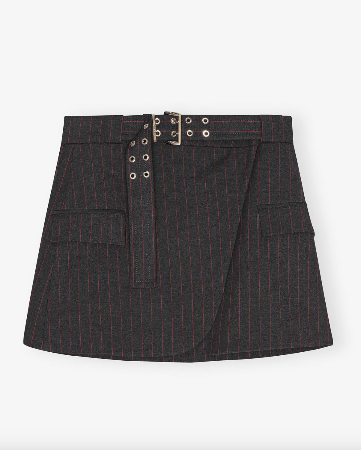This pinstripe wrap-style mini skirt combines tailored structure with standout detail. Designed with a bold red pinstripe, metallic eyelet belt, and functional front pockets, it adds an edge to everyday styling while maintaining a flattering, modern silhouette.