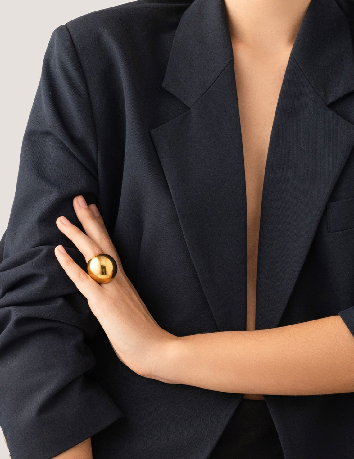 This statement ring is all about striking design and standout appeal. Its oversized spherical shape brings a galactic edge to your style, making it a perfect choice for those who love bold, attention-grabbing pieces. The high-polish gold finish adds sophistication, while the lightweight brass construction ensures comfort. If you’re between sizes, our reviewers suggest sizing down for a more secure fit.