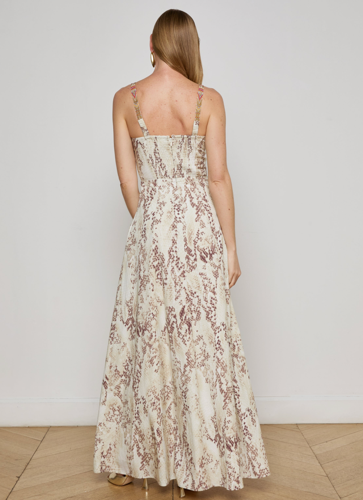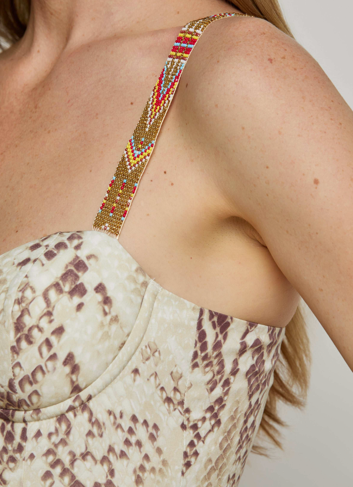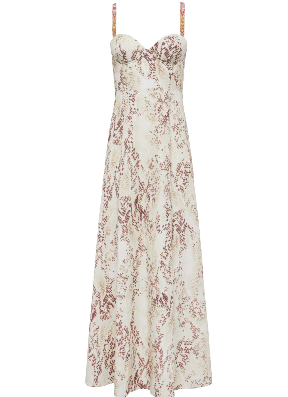 Turn heads in this show-stopping snakeskin print maxi. Designed to flatter with underwire cups and lightly padded support, this statement dress is elevated with beaded chevron straps for a touch of sparkle. The cotton-blend fabric moves beautifully, while side pockets and an invisible back zip keep it effortlessly functional. Glamorous yet grounded, this gown-length piece is perfect for your next standout moment.