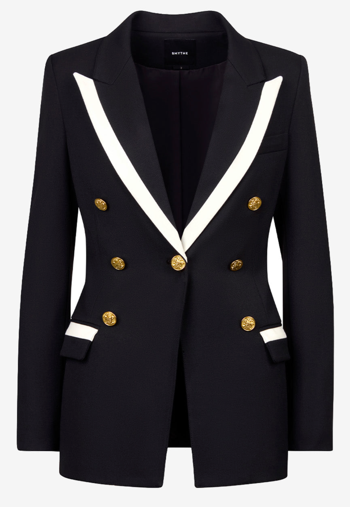 • Peaked lapels with contrast warm-white taping
