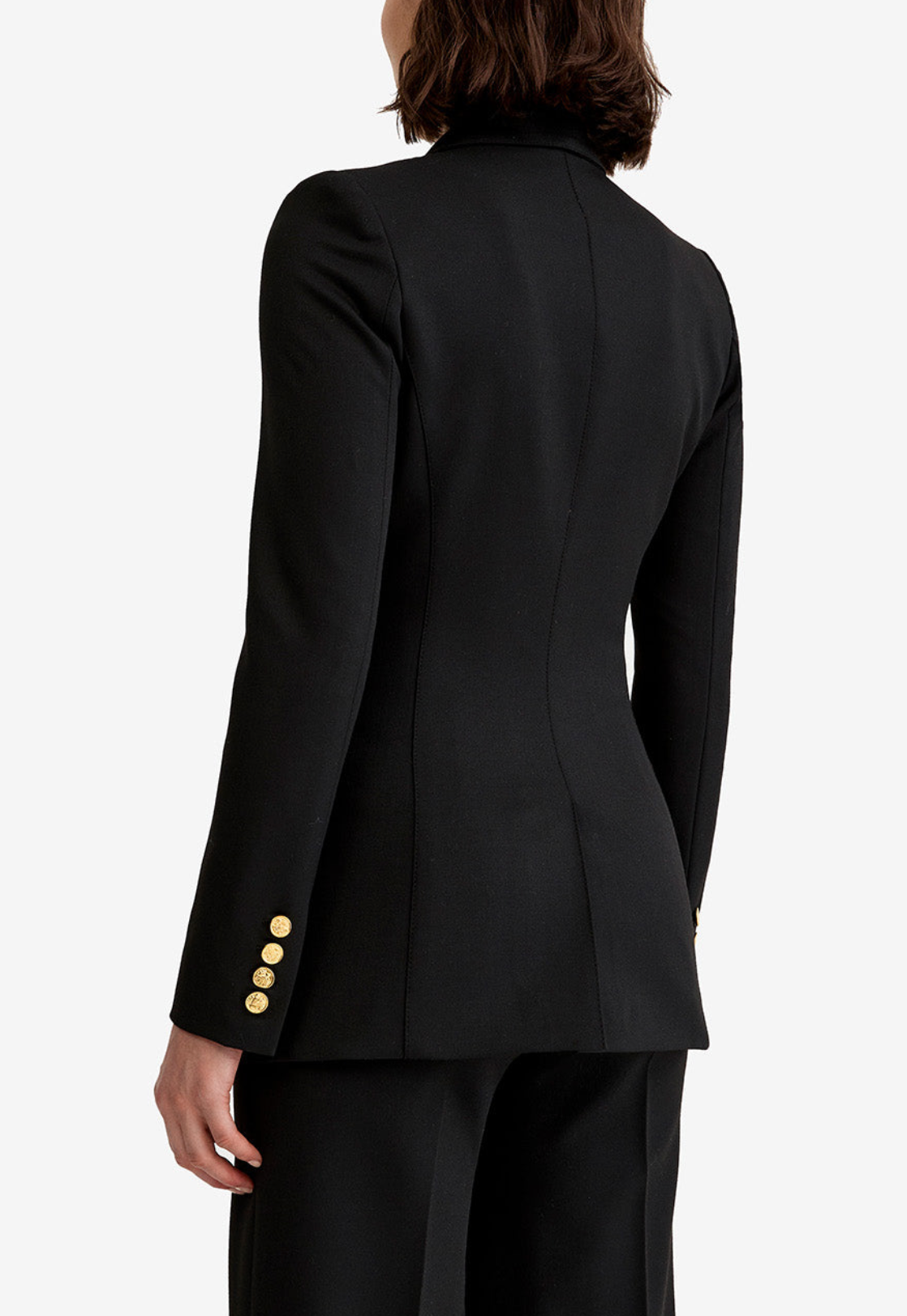 • Double-breasted button placement with single-breasted construction