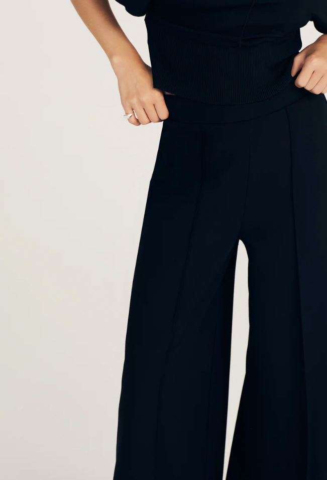 The Tempest Wide Leg Knit Trouser is a softly tailored crepe knit crafted with ribbed details. They feature a front leg crease and a flowy silhouette.