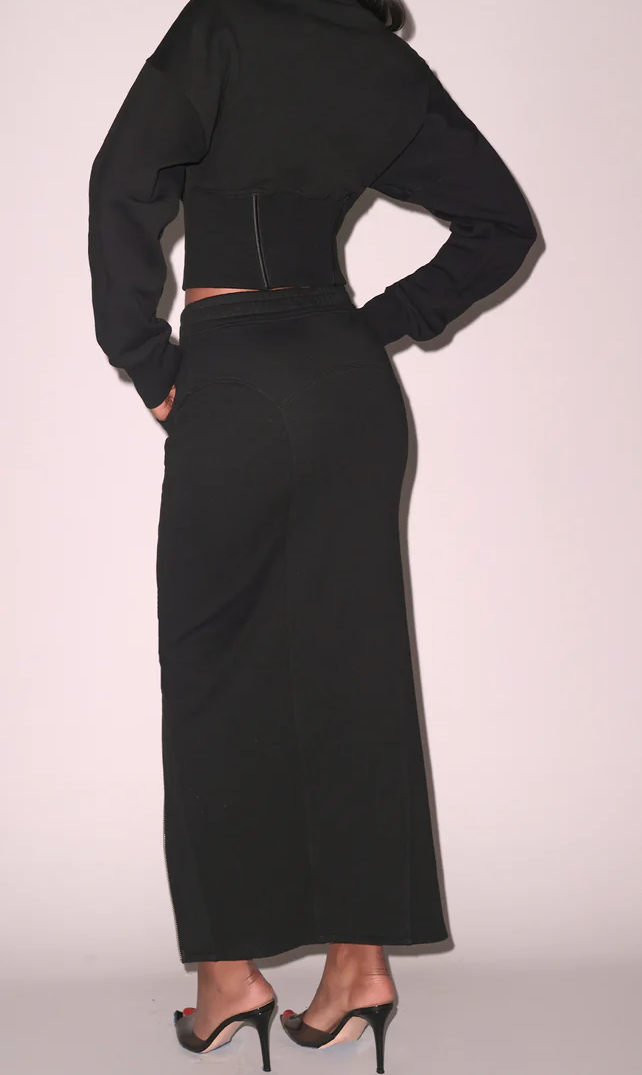 A French Cotton Terry Maxi Skirt with a zipper that runs the full front length of the garment with a wide elastic waistband and a silk drawstring. Super sexy in its styling, allowing you to choose the depth of the front slit with a zip!