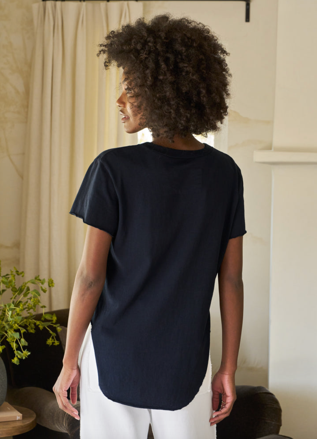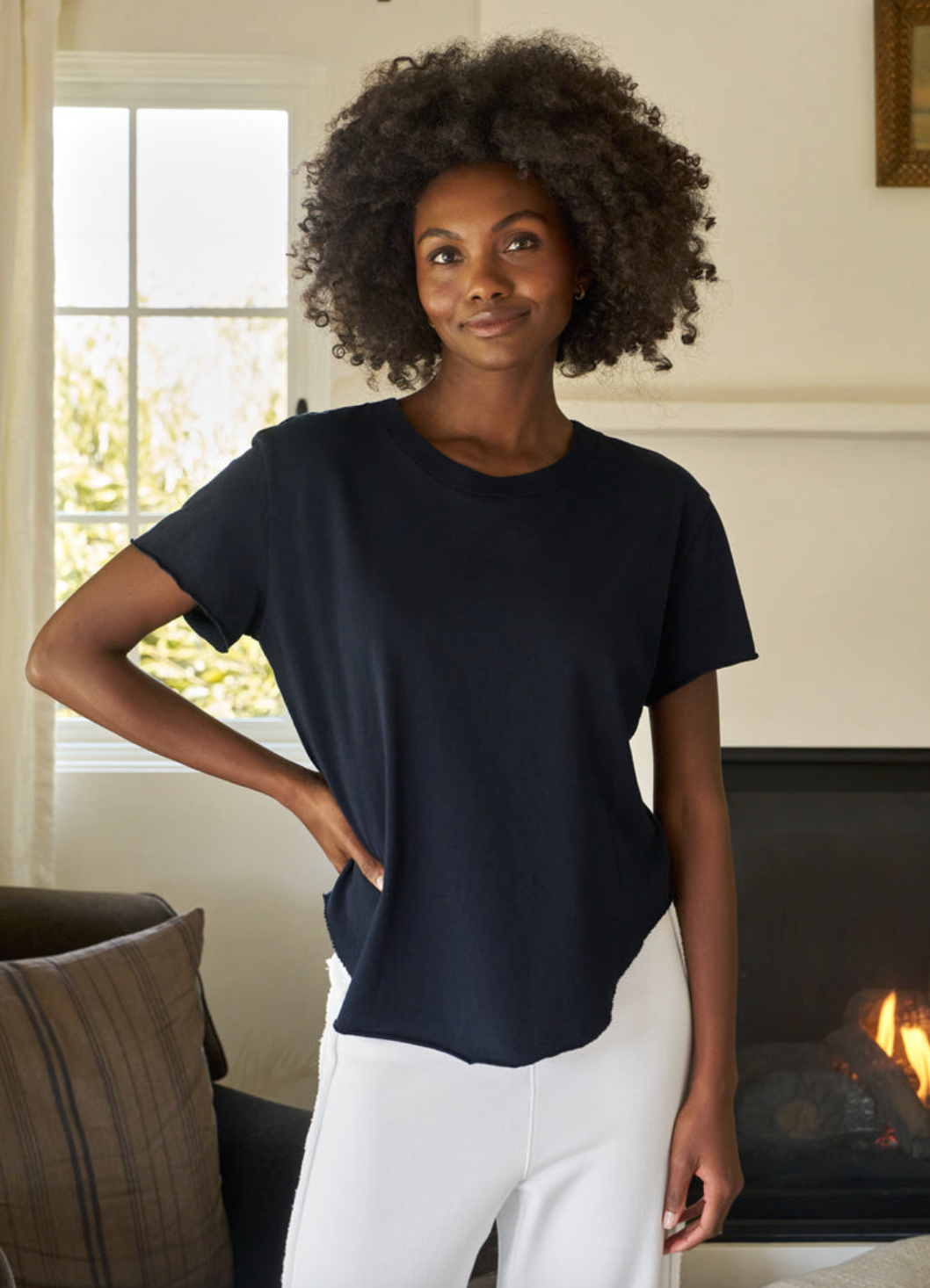 The Perfect Tee is the ultimate wardrobe essential that combines effortless style with timeless comfort. Featuring a classic crew neck, a hand-cut raw curved hem that provides extra coverage, and high-low sides for a laid-back yet flattering fit, this tee is designed to pair with everything in your closet. Made from soft, breathable 100% cotton, it offers a relaxed fit that’s perfect for layering or wearing solo. The unique garment-dye process gives each tee a one-of-a-kind finish that will continue to evolve and soften with every wear. Whether you're dressing it up or down, this tee is truly a closet staple.
