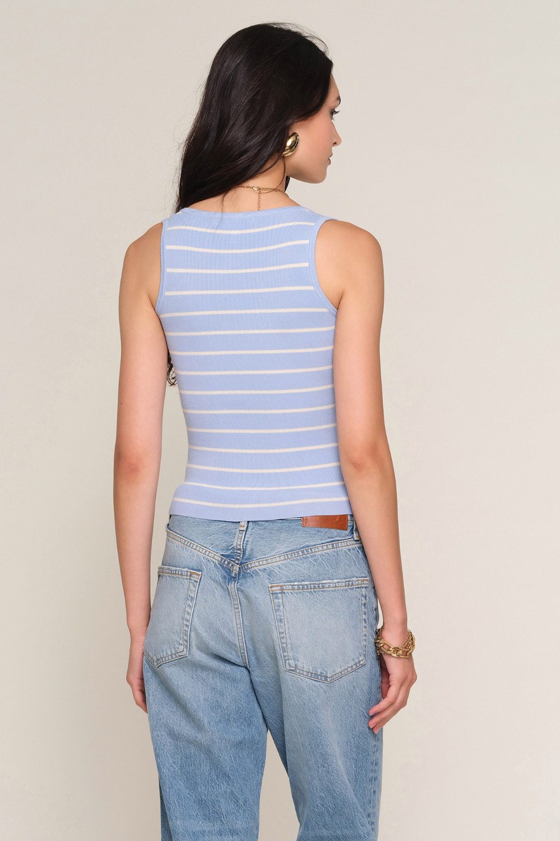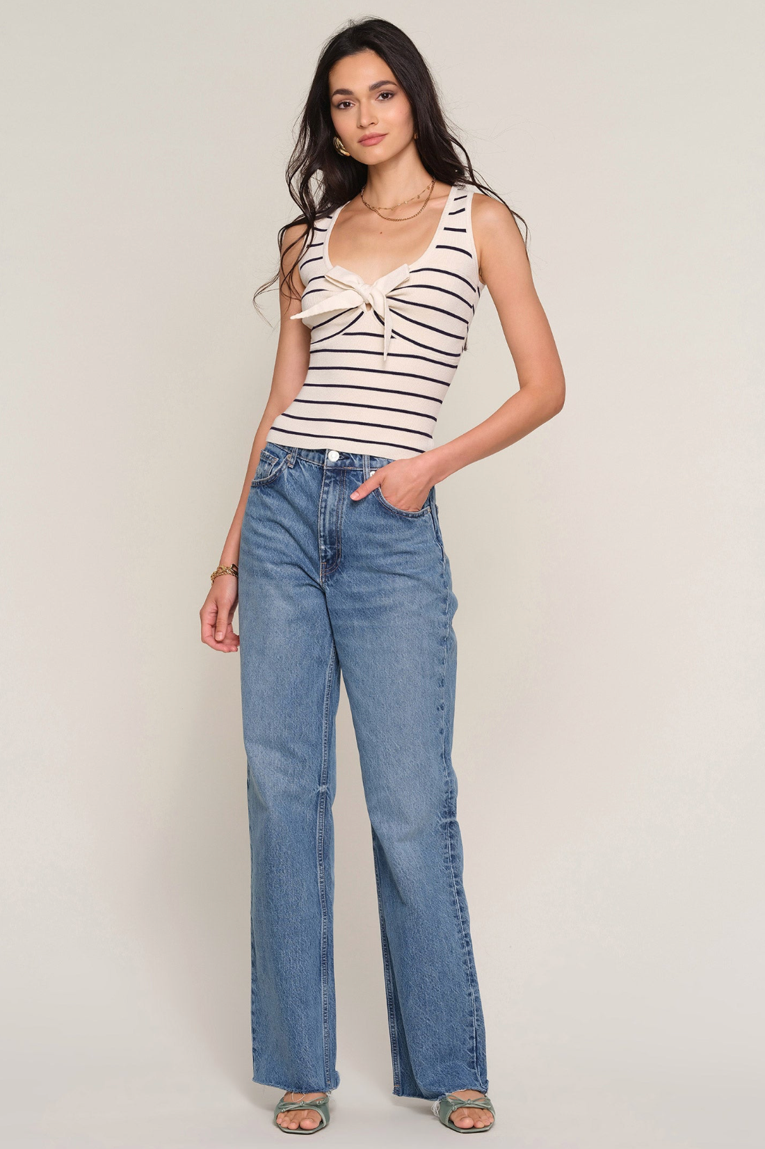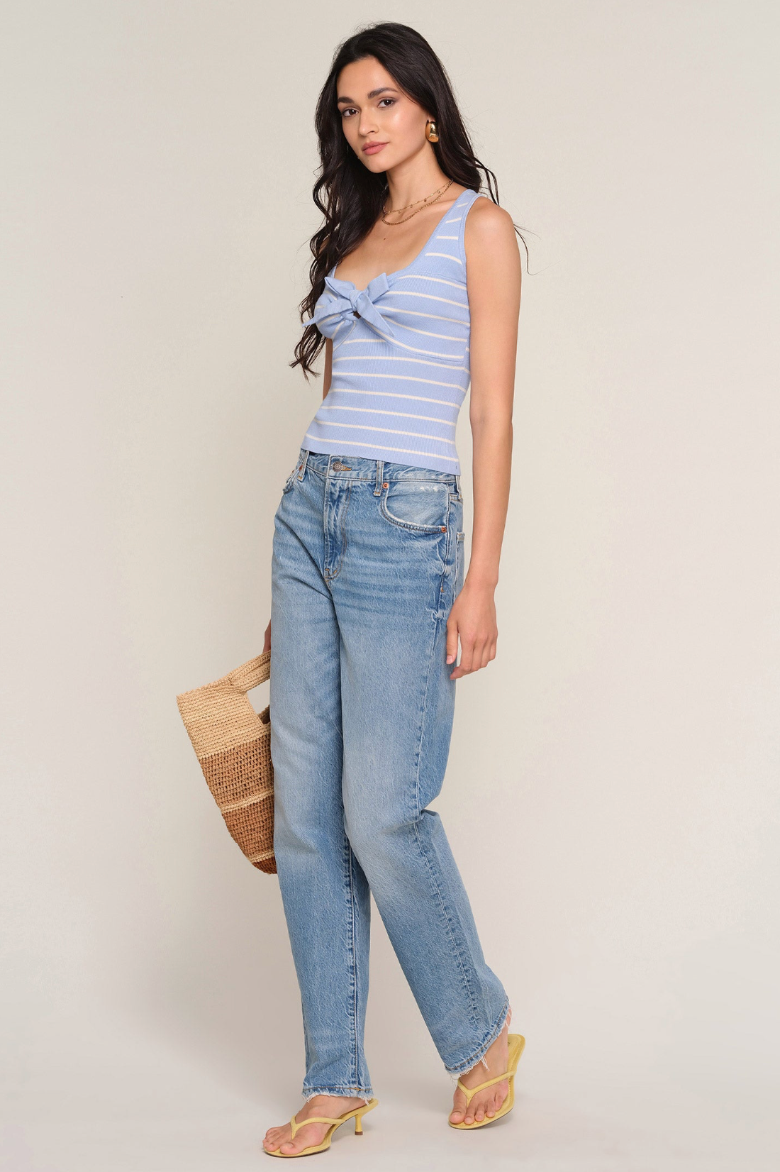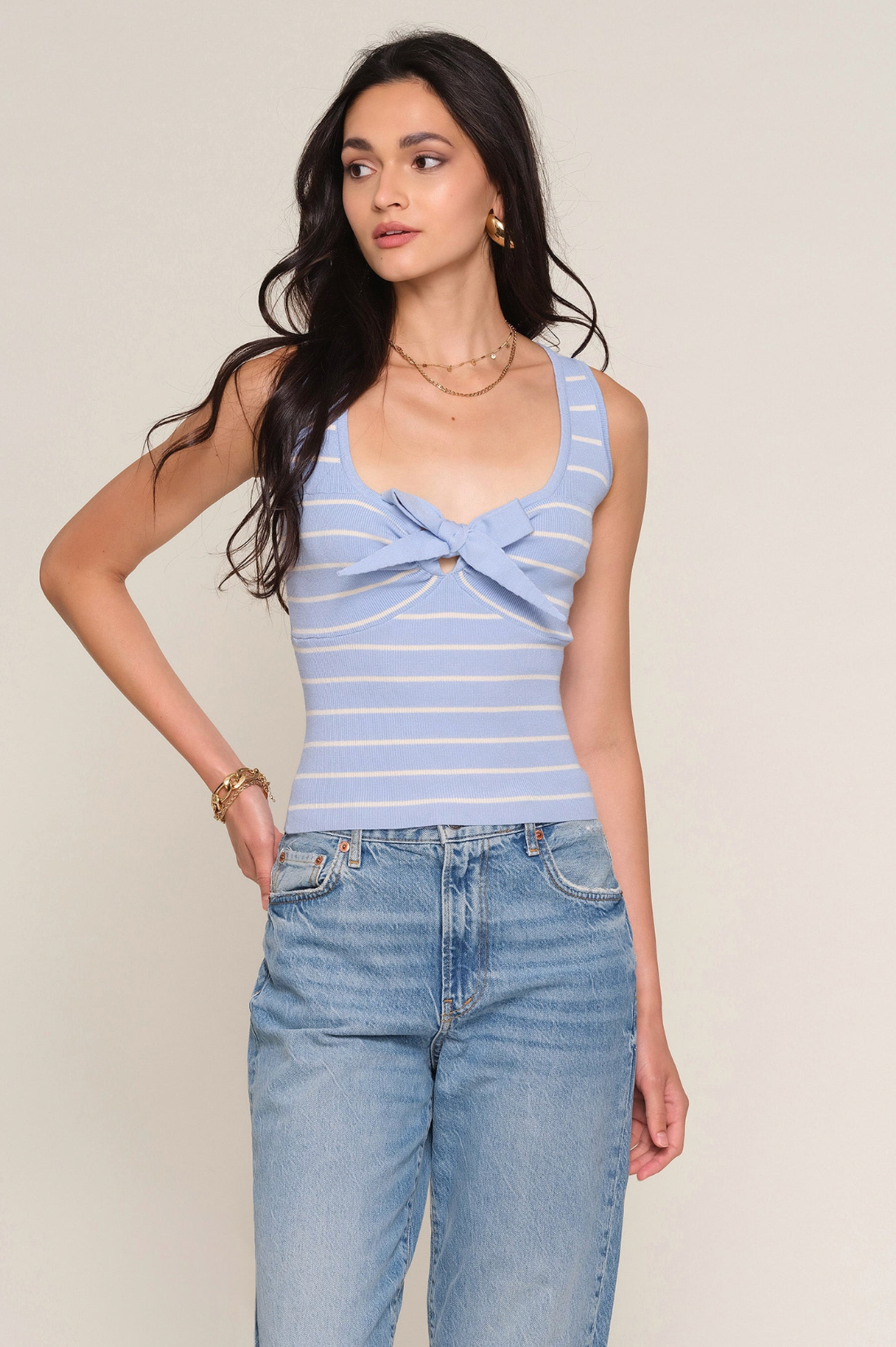 A feminine knit with a playful touch, this slim-fit top is crafted from a soft melange yarn for a cozy yet lightweight feel. Finished with contrast striping and a delicate front bow detail, it adds charm to an easy, everyday silhouette.