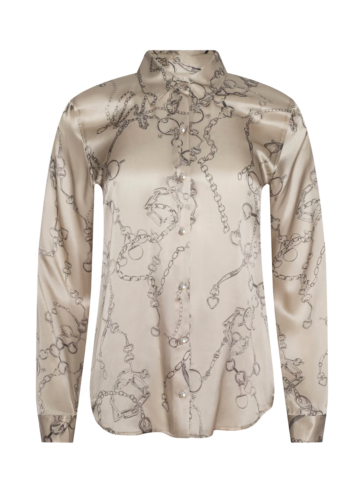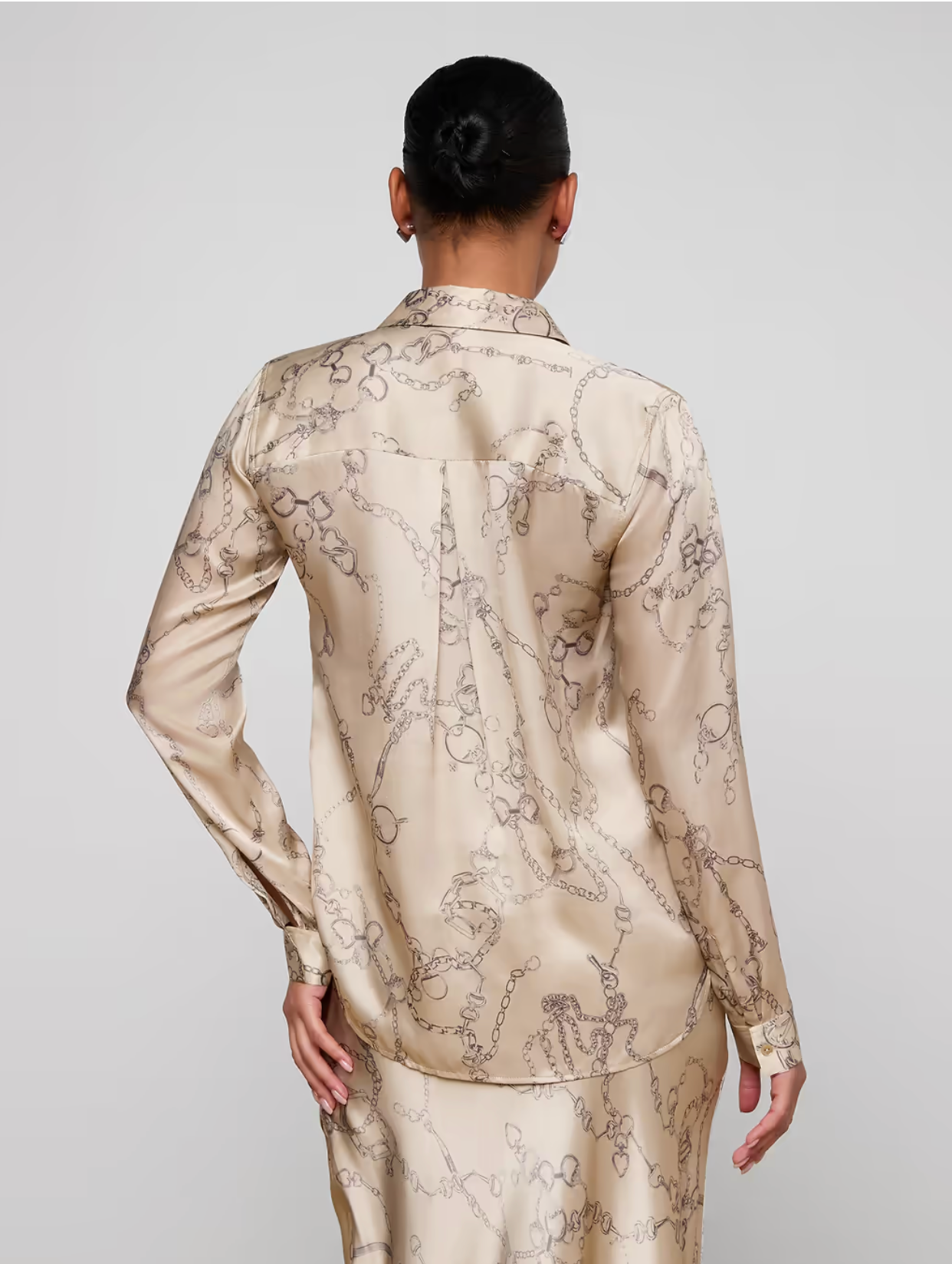 Presenting the epitome of timeless dressing - a lustrous silk charmeuse blouse adorned with a captivating print and a beautifully contrasted backdrop. This blouse encapsulates refinement, boasting a stand collar, long button-cuff sleeves, and a back yoke with an inverted pleat, showcasing sharp sartorial craftsmanship. The open neckline, curved hem, and liquid hand feel introduce a subtle touch of femininity. A versatile choice that effortlessly harmonizes with both jeans and skirts. The blouse is elegantly finished with a front button closure, a testament to its attention to detail. Crafted entirely from 100% silk, this piece epitomizes luxury and style.