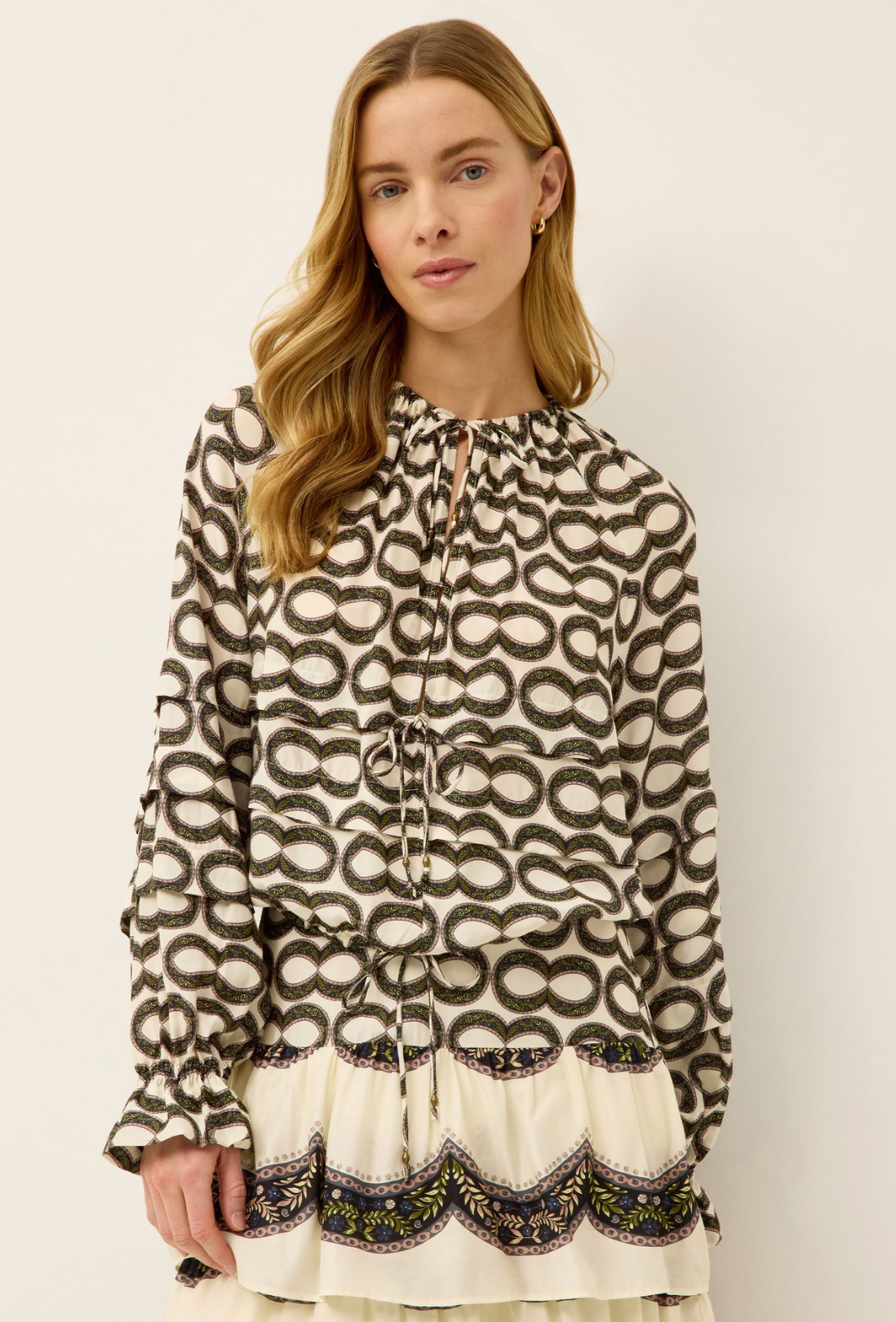 A modern take on bohemian style, the Umi blouse brings soft dimension and effortless movement to your wardrobe. Designed with a plunging neckline and adjustable tie front, its relaxed cropped fit and delicate pleating create a look that’s both easy and statement-making.