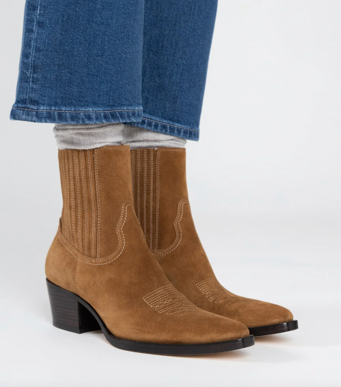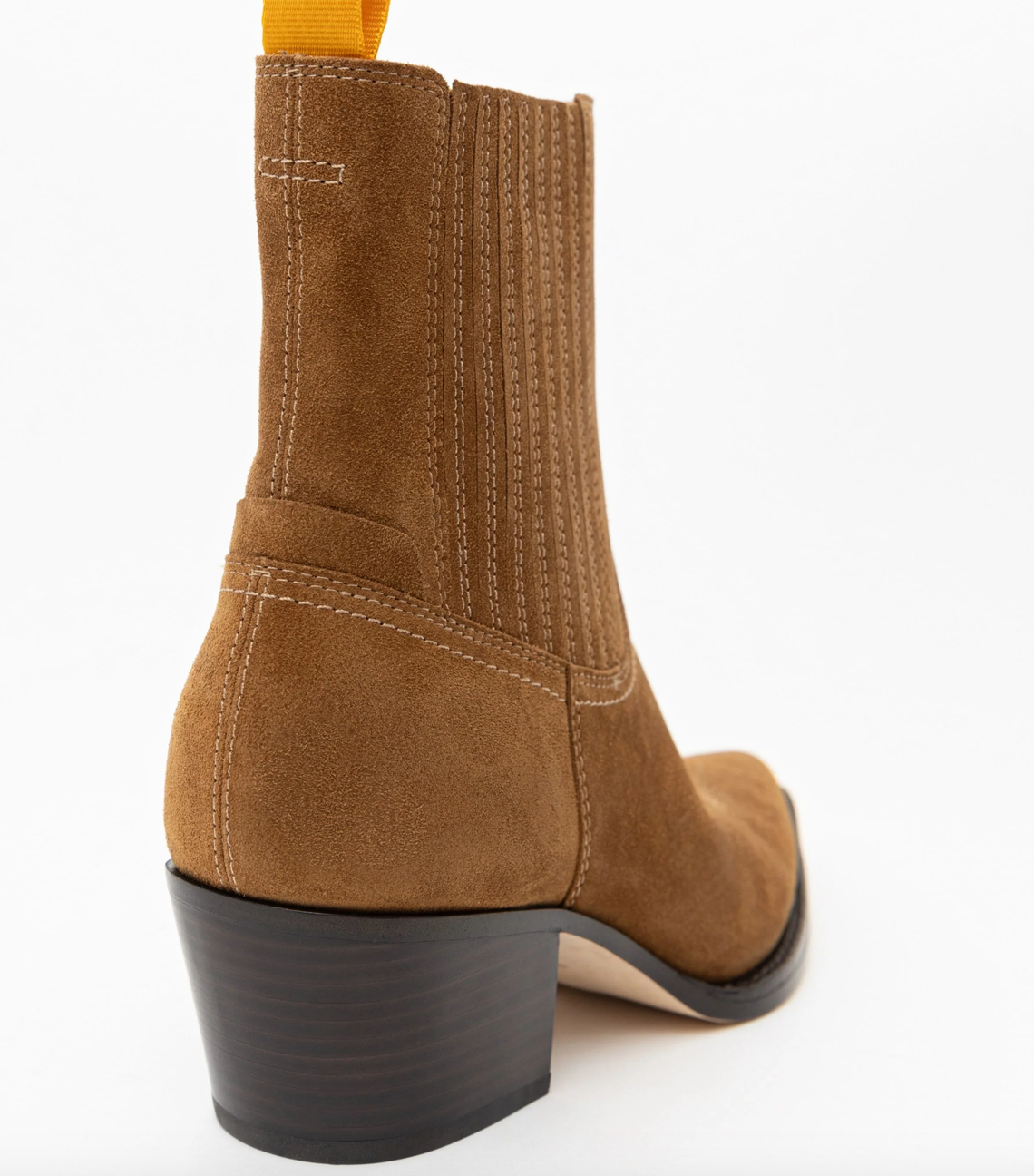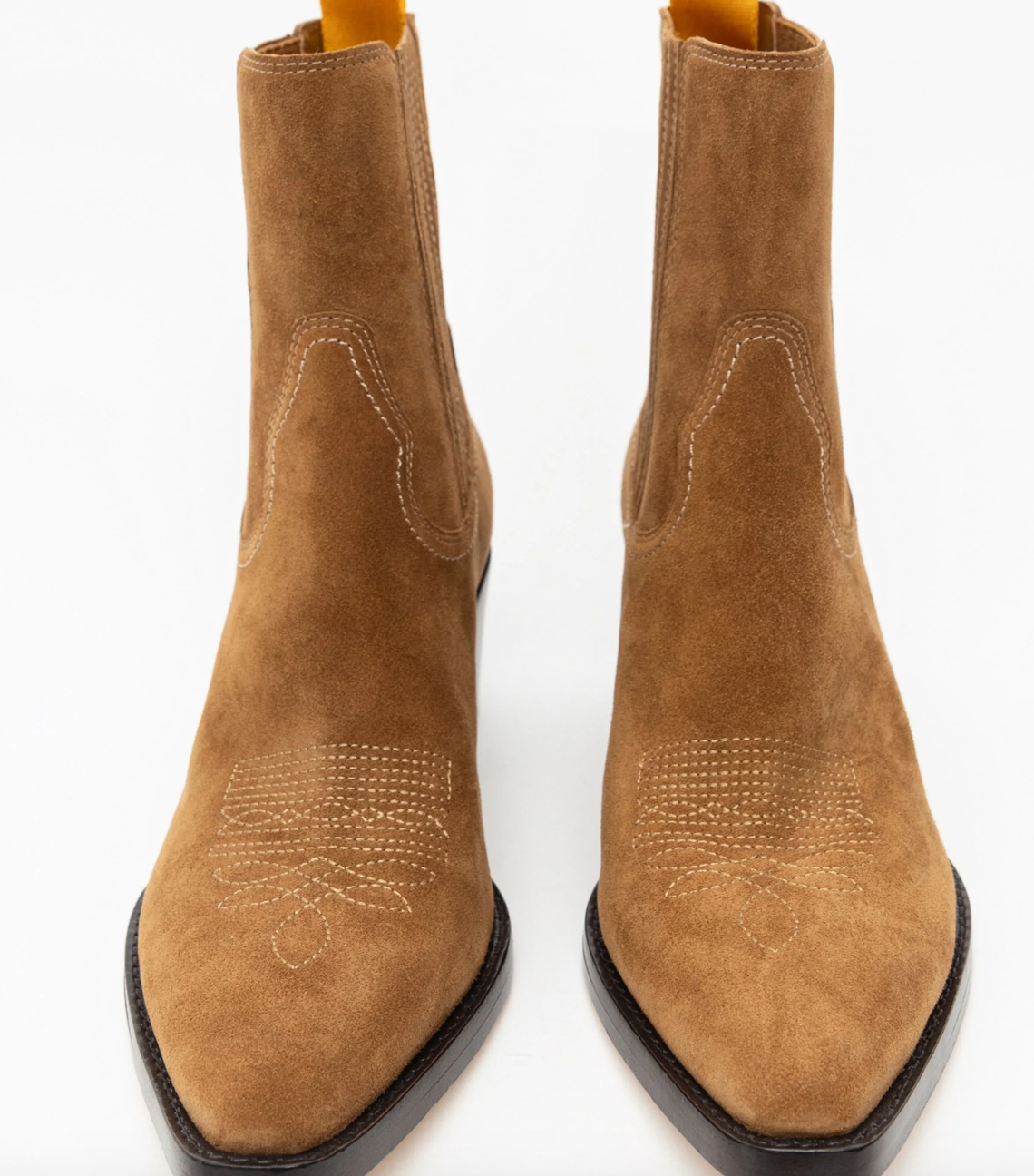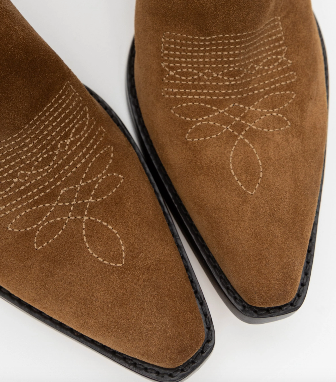 The **Wyoming Western Boot** combines elegance and functionality, offering the perfect balance of style and comfort. Crafted from Italian Cashmere Suede in a warm cognac hue, these boots feature a short shaft and a classic western-inspired design. The leather outsoles and genuine leather welt ensure long-lasting durability, while the cushioned insole provides exceptional comfort. Whether you're dressing up for a night out or adding a chic edge to a casual look, these boots are the ultimate statement piece for any occasion.