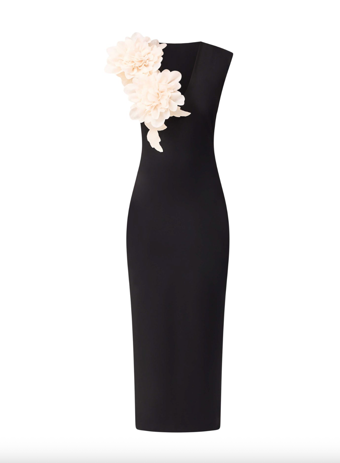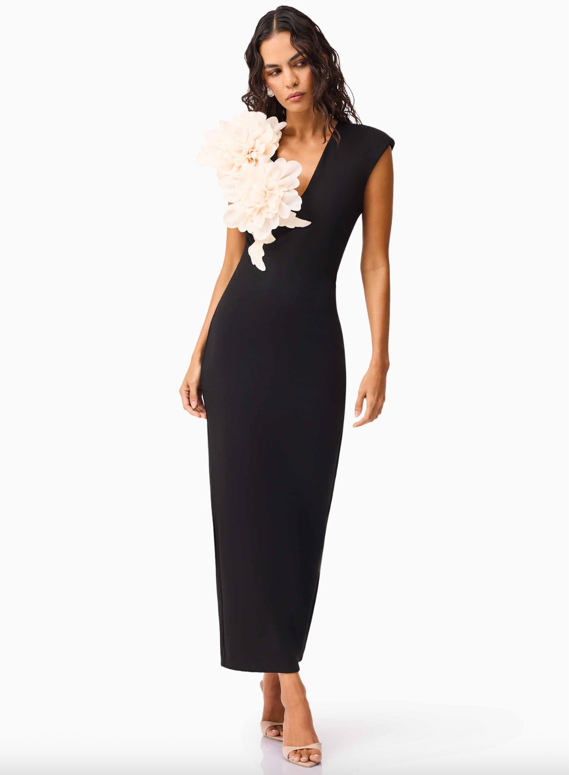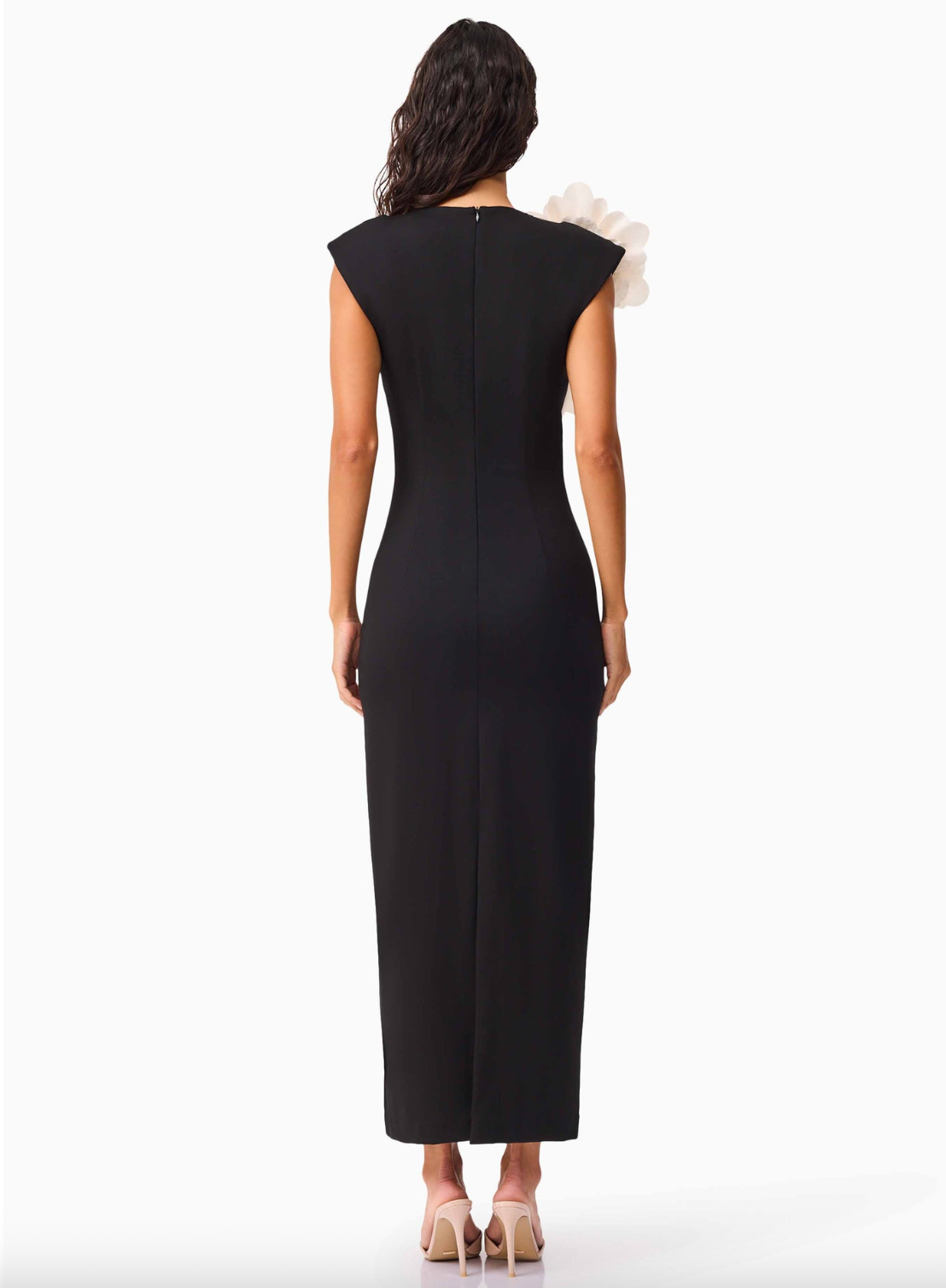 Elegant with a daring edge, the ZAHARA V-Neck Gown in black redefines modern eveningwear. Featuring a plunge V-neckline that elongates the silhouette and romantic contrast flower trim, this gown effortlessly combines sophistication with feminine allure. Crafted from a structured suiting fabrication with a touch of stretch, it flatters the body while ensuring comfort and ease of movement. Fully lined for a smooth fit and finished with an invisible center back zipper, ZAHARA delivers sleek, confident glamour for any formal occasion.